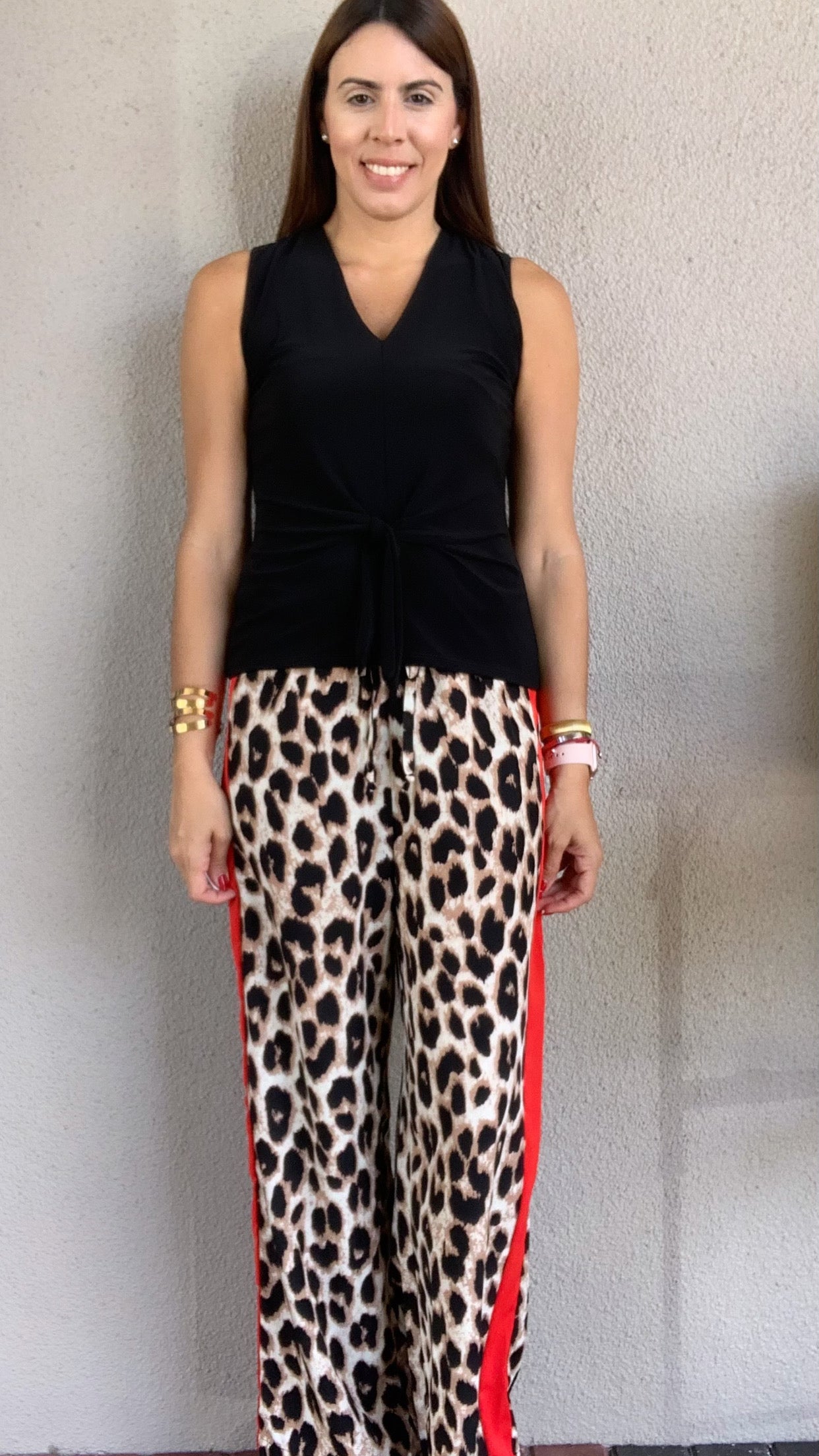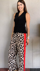 Leopard Print Elastic Waist Pant with Red Side Seam