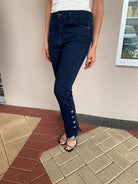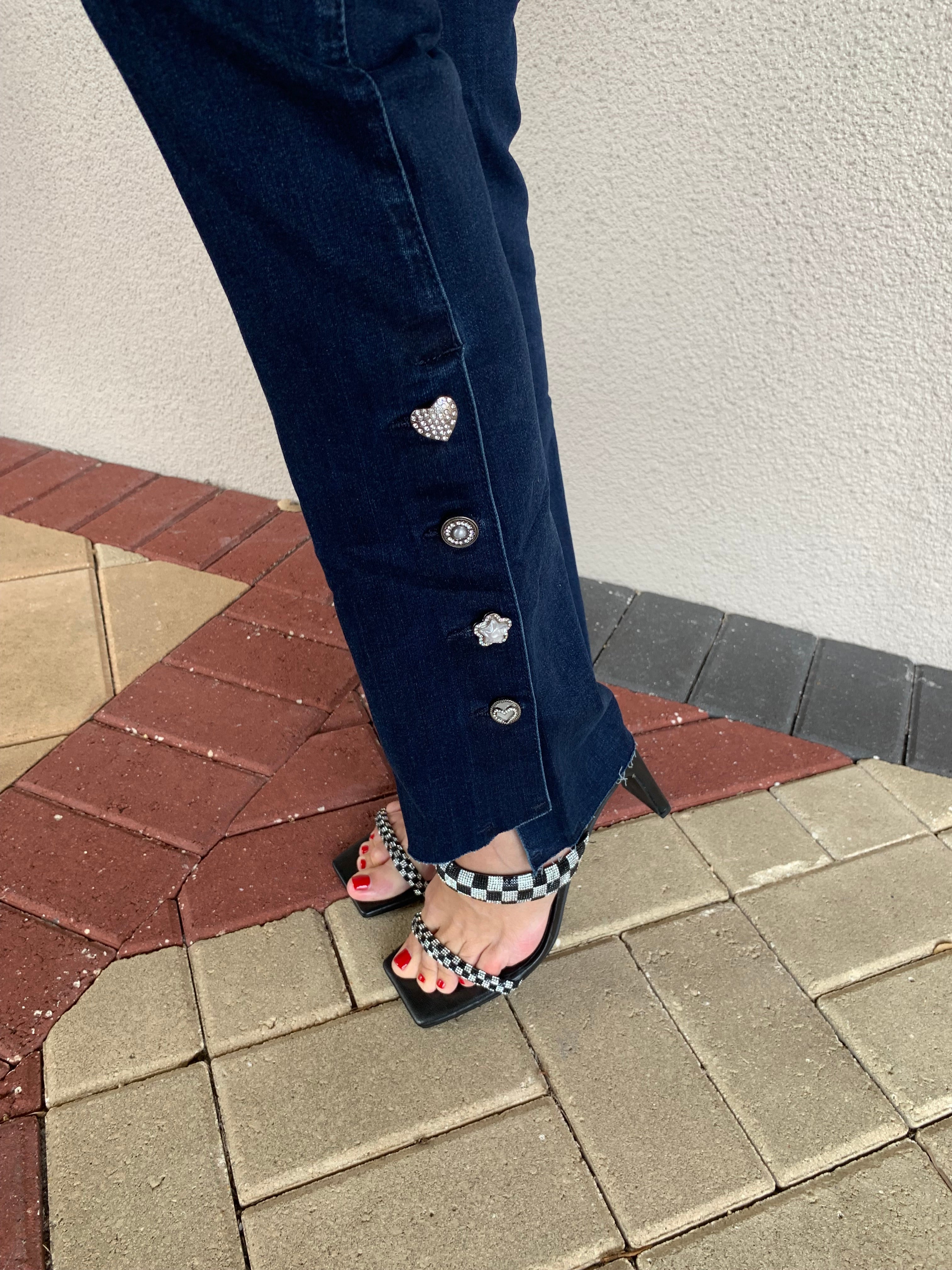 Elevate your denim game with our stunning Gem Button Bootcut Jeans. Crafted from beautiful blue-black denim, these jeans pair effortlessly with any top, making them a versatile addition to your wardrobe. The eye-catching gem buttons and stylish raw-edge hem add a chic twist to a classic design, ensuring you stand out in any setting. With a flattering mid-rise waist and bootcut leg, these jeans are perfect for creating stylish looks this fall.