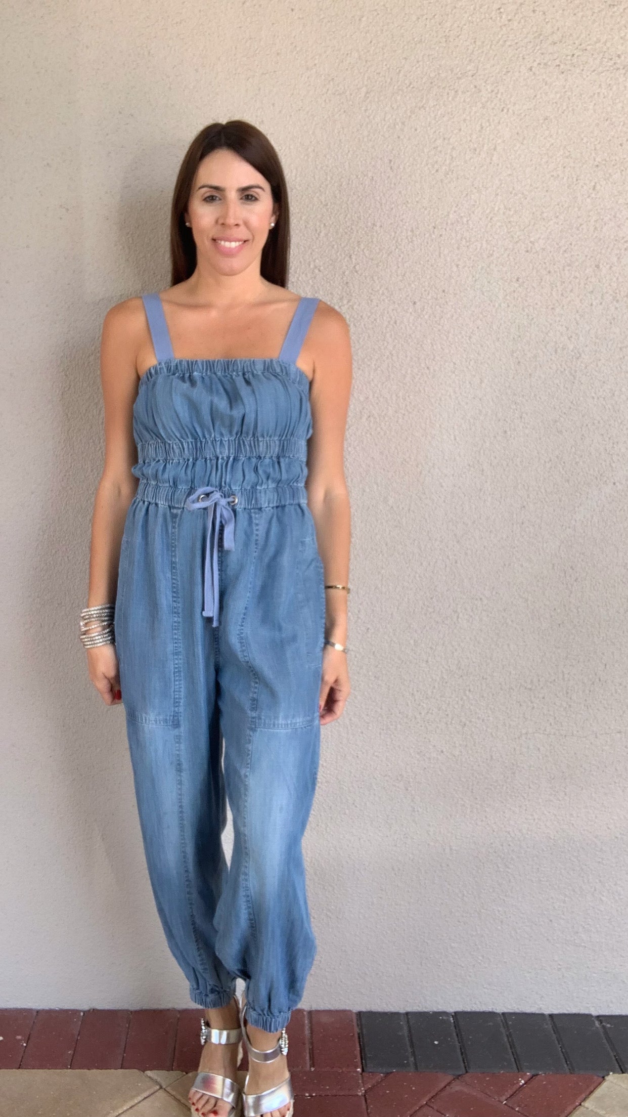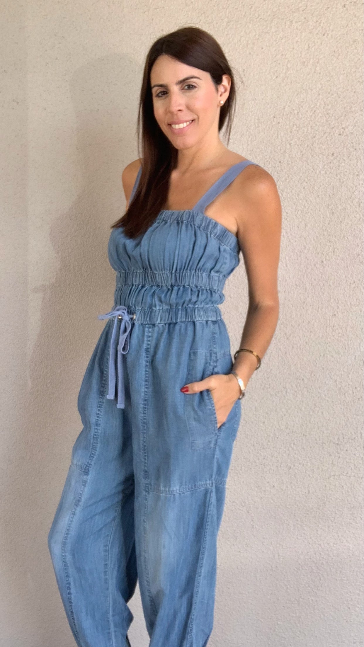 This stylish Denim Jumpsuit effortlessly blends casual cool with a touch of elegance. Featuring adjustable tank straps and a flattering tie detail at the waist, it cinches in all the right places while allowing for easy, all-day comfort. The classic denim fabric offers durability and timeless appeal, making this jumpsuit perfect for a day out or a relaxed evening look.