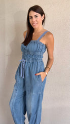 Denim Jumpsuit with Tank Straps and Tie Detail