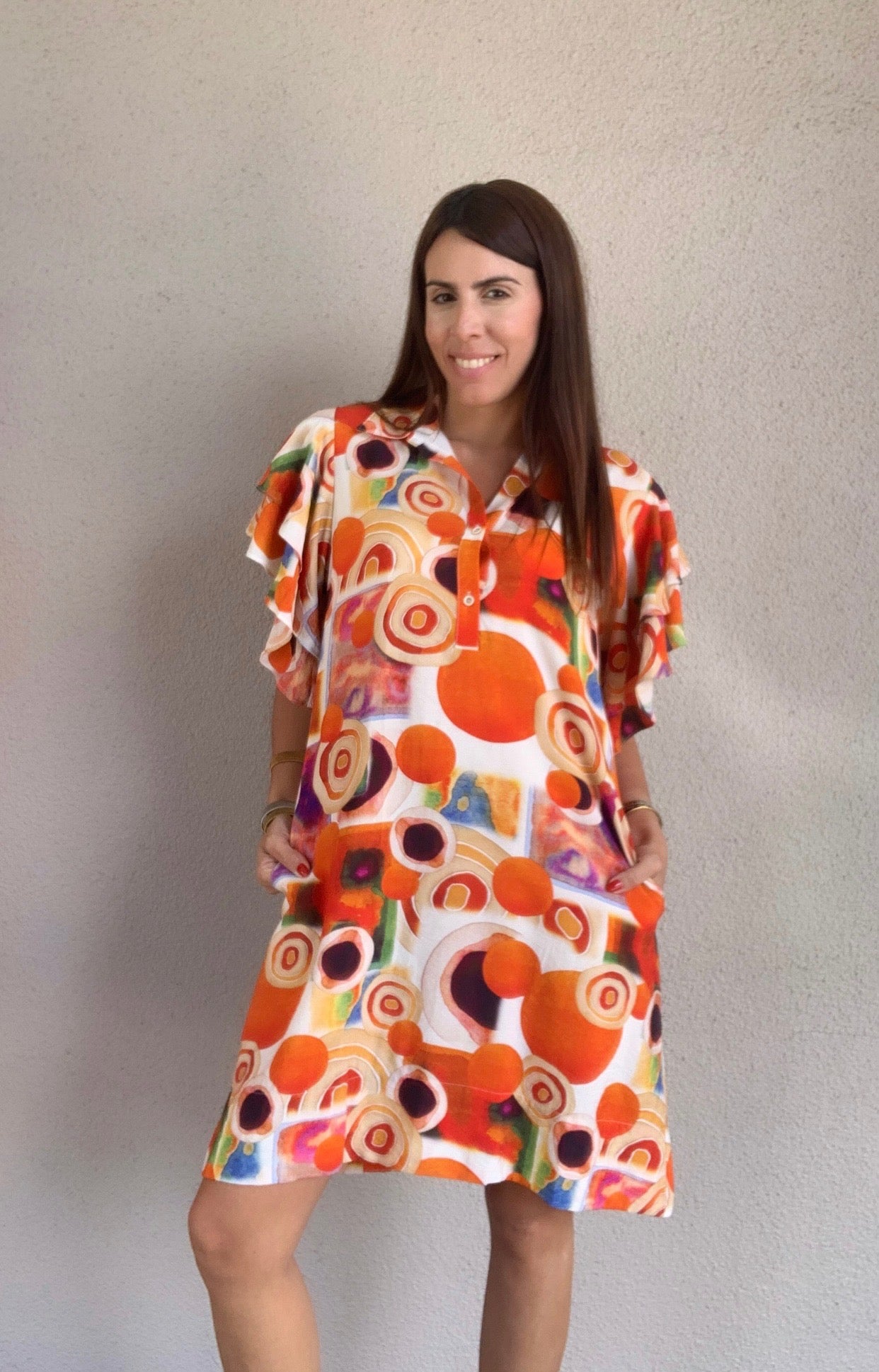 Bring bold energy and playful charm to your wardrobe with this Double Flounce Sleeve Knee-Length Dress in a vibrant carnival print. Bursting with color and movement, this dress is designed to turn heads. The layered flounce sleeves add dramatic flair and a touch of whimsy, while the knee-length silhouette keeps the look polished and versatile.