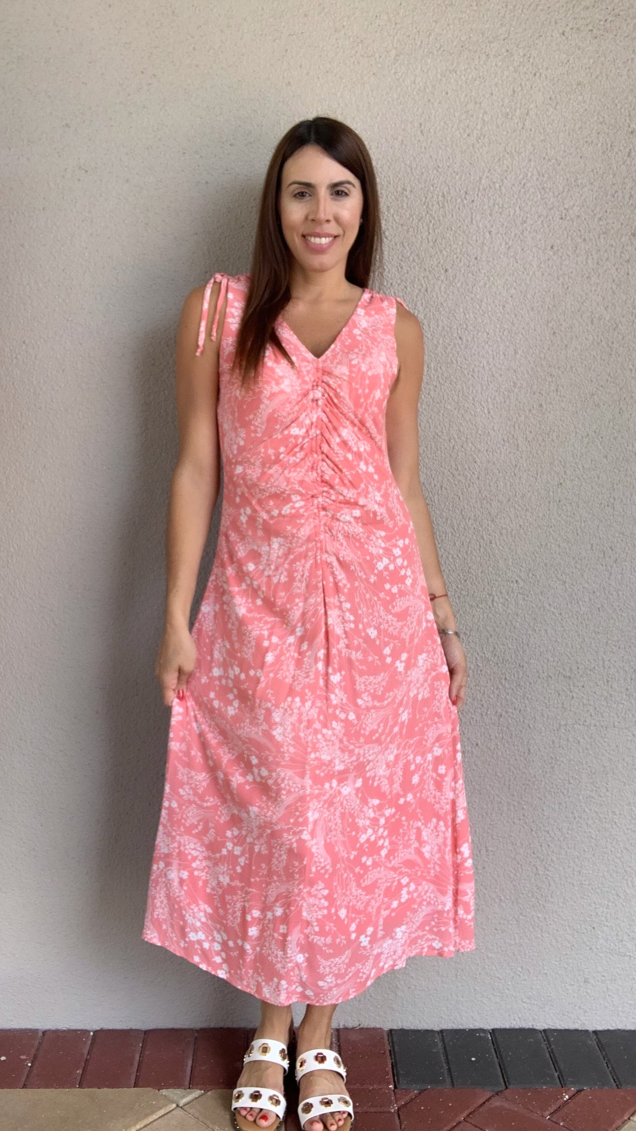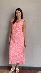 Elevate your wardrobe with the Hannah Dress, featuring a captivating pink and white floral print that exudes elegance. Its deep V-neckline and breezy short sleeves offer a flattering, comfortable fit perfect for any occasion. Embrace effortless style and luxury in this beautifully relaxed dress.