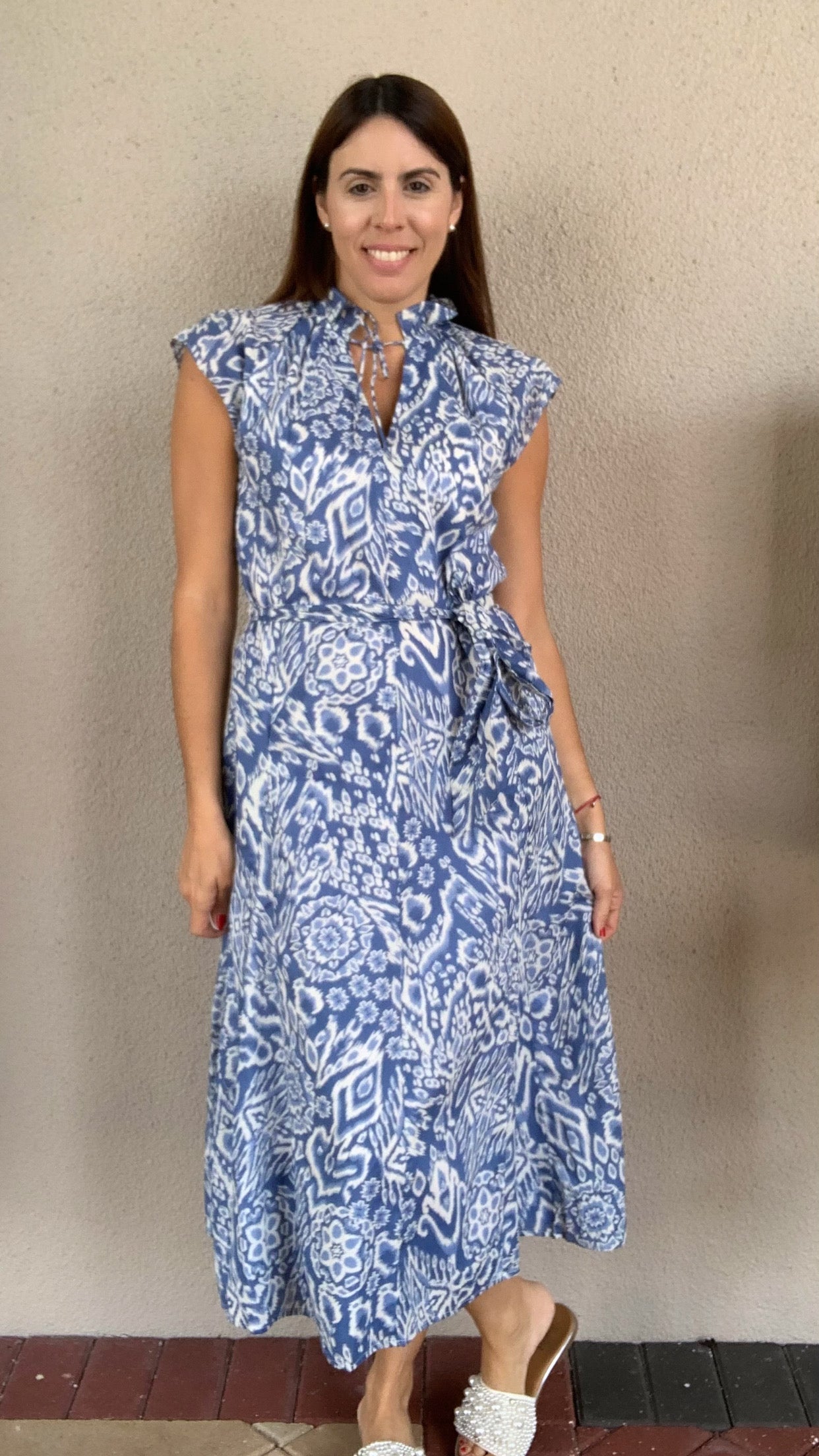 Printed Maxi Dress with Cap Sleeve & Matching Tie Detail