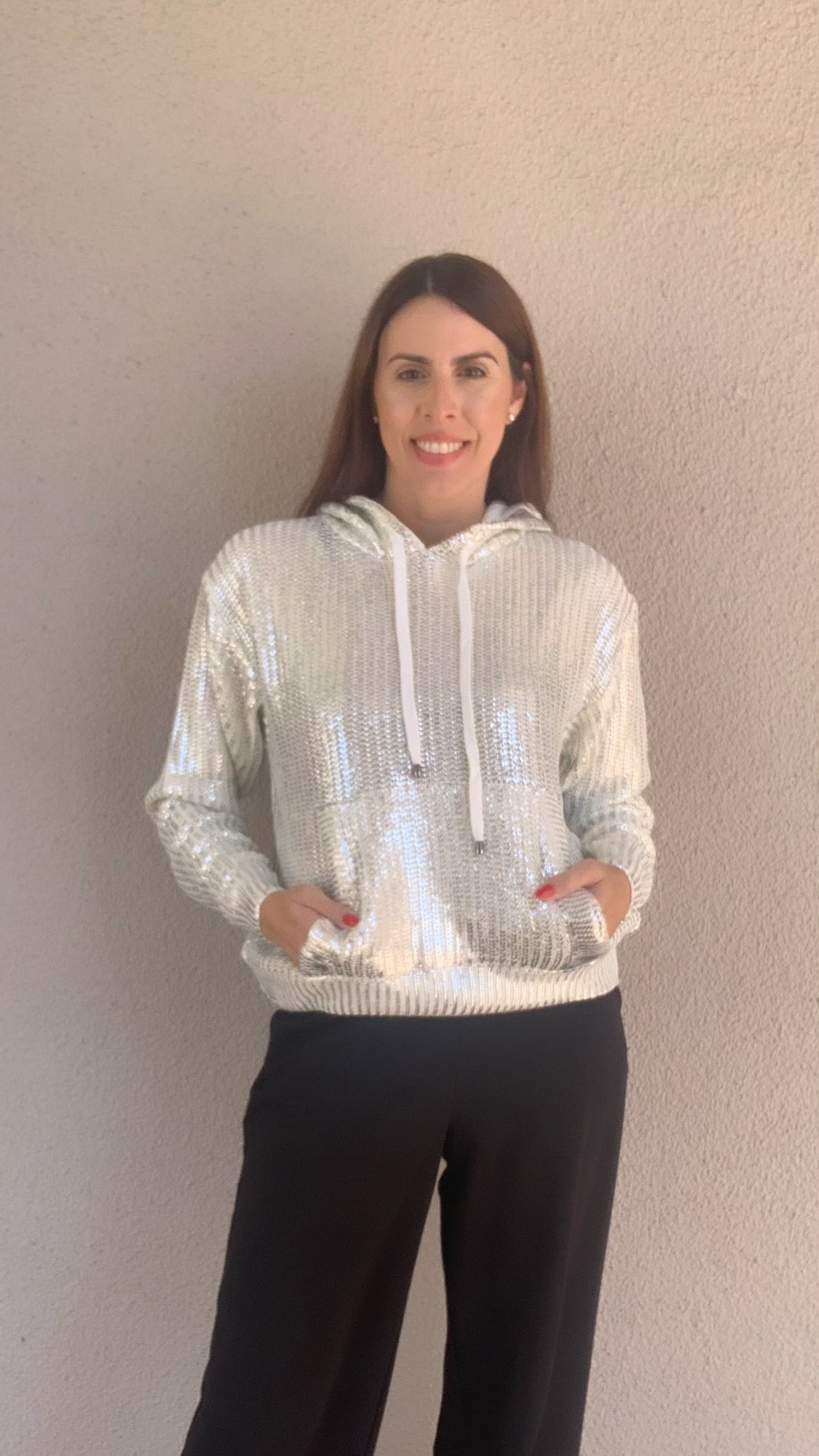 Stay stylish and cozy with this Knit Hooded Sweatshirt featuring a subtle shimmer coating. Its soft knit fabric ensures comfort, while the shimmering finish adds a hint of sparkle to your everyday look. Perfect for layering or wearing on its own, this hoodie combines warmth and eye-catching detail effortlessly. Elevate your casual wardrobe with a piece that shines as much as you do.