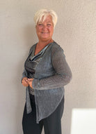 Elevate your style with the Sheer Shimmer Tie Front Cardigan. This lightweight, translucent layer adds a subtle sparkle to any outfit, perfect for transitioning from day to night. The adjustable tie front ensures a flattering fit, while the shimmering fabric effortlessly enhances your look with delicate elegance. Ideal for layering over dresses or casual tops, this cardigan brings a touch of sophistication and shimmer to your wardrobe.