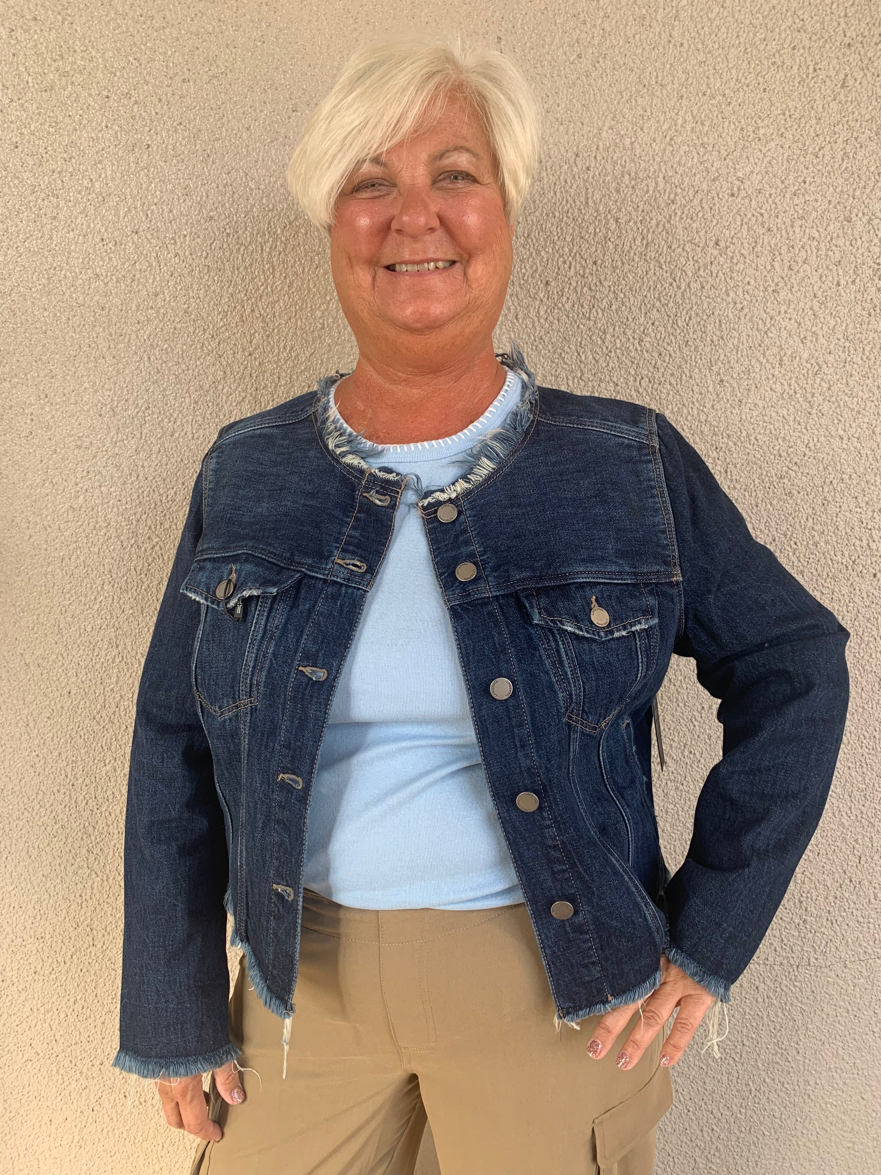 Add a touch of modern edge to your wardrobe with the Button-Front Denim Jacket with Fray Hem. This classic denim jacket is reimagined with a raw, frayed hem that adds a playful, deconstructed twist to the traditional design. Featuring a button-down front, front chest pockets, and a timeless collar, this jacket offers both style and practicality. Made from durable yet soft denim, it’s the perfect piece for layering over casual outfits or pairing with dresses for an effortlessly cool, laid-back look.
