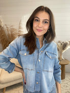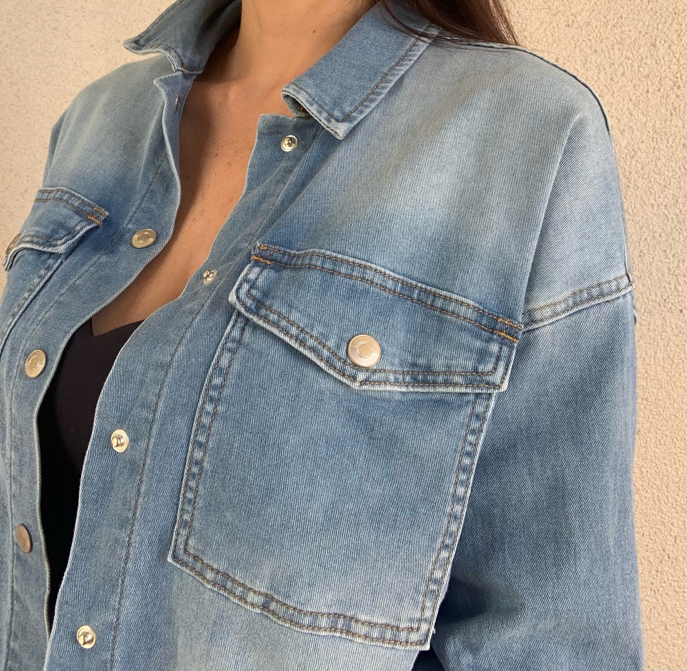 This stunning Cropped Denim Shacket brings together classic style and a modern cropped silhouette for a fresh, fashion-forward look. Designed with a snap-up front closure and a timeless shirt collar, it’s as functional as it is stylish. Featuring flap chest pockets with snaps, casual drop-shoulder sleeves with open cuffs, and a lightweight denim fabric with just a touch of stretch, this shacket is ideal for effortless layering. Perfect for adding an edge to any outfit, it’s a versatile staple you’ll reach for again and again.