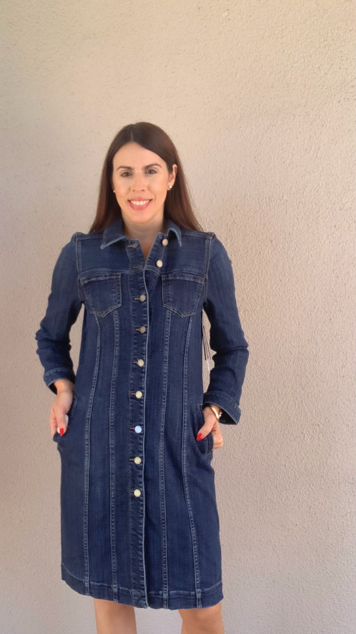 This knee-length trucker denim jacket blends classic style with modern coverage. Featuring a long, button-front design, it offers an effortlessly chic silhouette that complements any outfit. Crafted for durability and comfort, this jacket is perfect for layering, adding a versatile