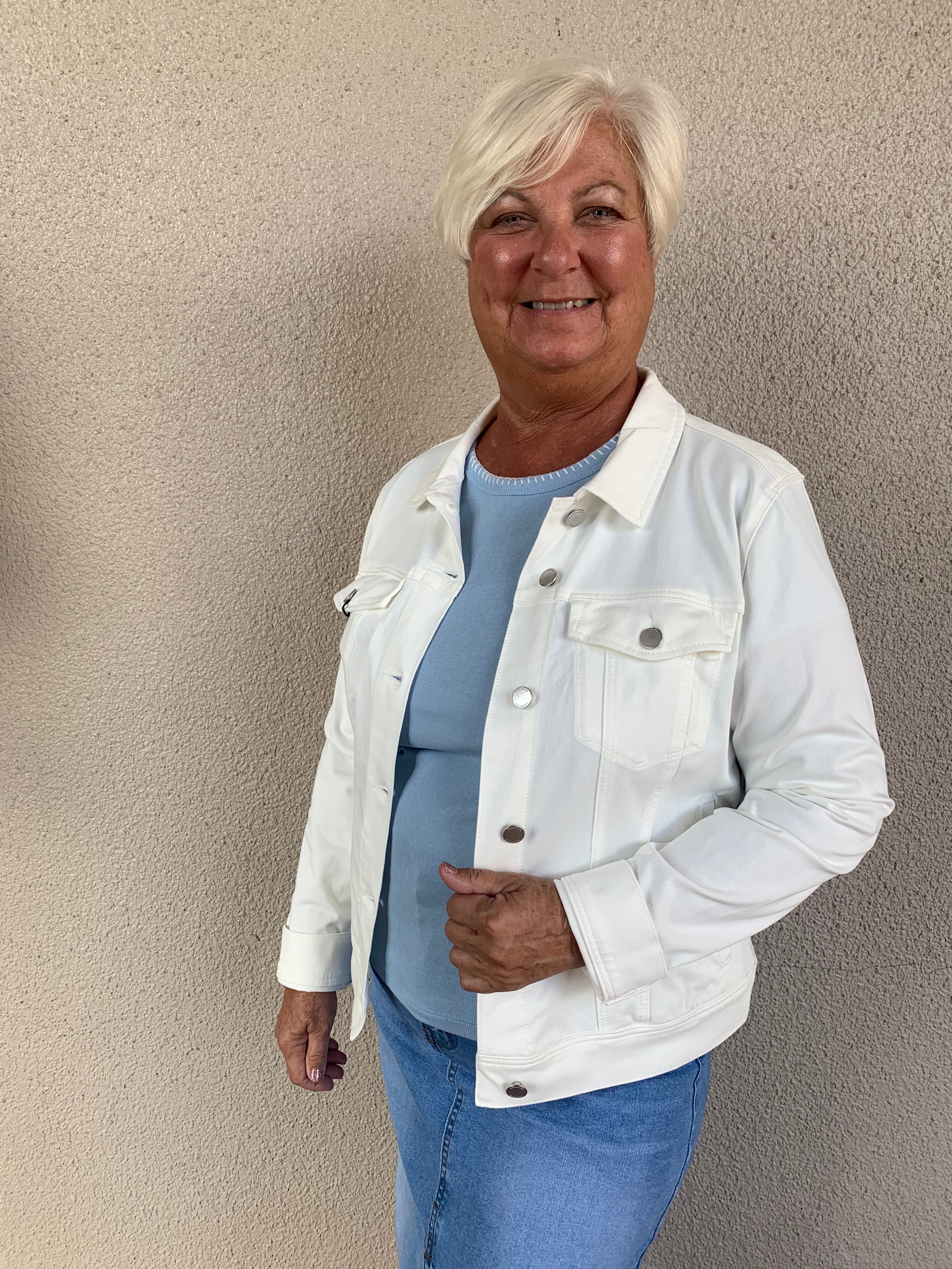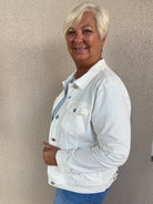 Freshen up your wardrobe with the Stretch Classic Button-Front Denim Jacket in White, a versatile twist on a timeless favorite. Crafted from a stretchy, high-quality denim blend, this jacket offers both comfort and a flattering fit. The button-front closure, classic collar, and front chest pockets bring a touch of tradition, while the crisp white hue adds a modern, clean aesthetic. Perfect for layering over dresses, skirts, or casual outfits, this jacket is the ideal piece for effortless, everyday style.