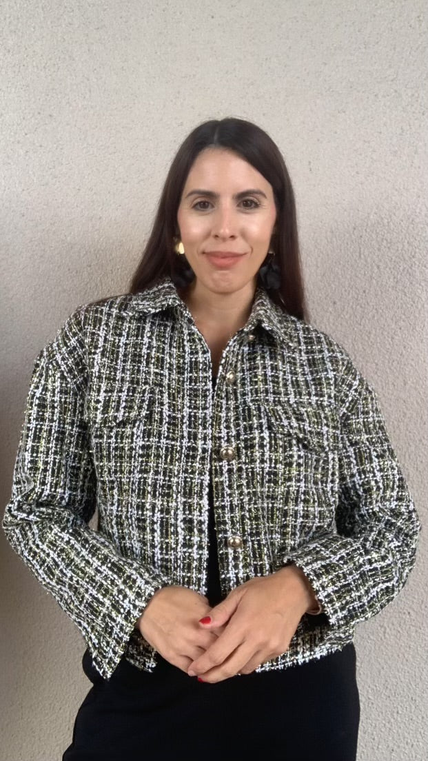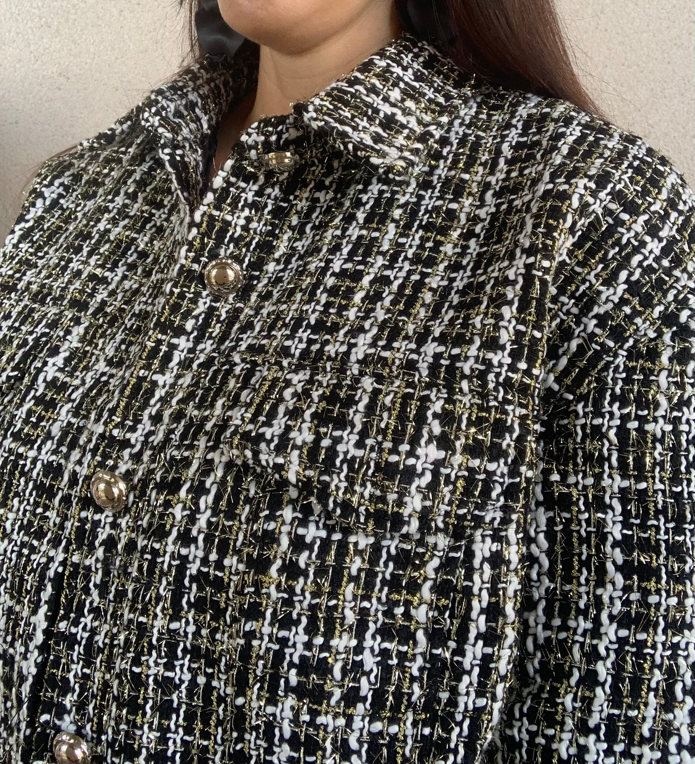 This stunning Metallic Tweed Button-Front Jacket combines timeless sophistication with a touch of glamour. Crafted from a rich blend of black, white, and gold metallic tweed, this jacket captures attention with its subtle shine and textured elegance. Featuring a button-front closure and a classic collar, this piece strikes a balance between structured style and luxurious flair. With its tailored yet relaxed silhouette, this jacket is perfect for adding a sophisticated layer to both casual and formal outfits.