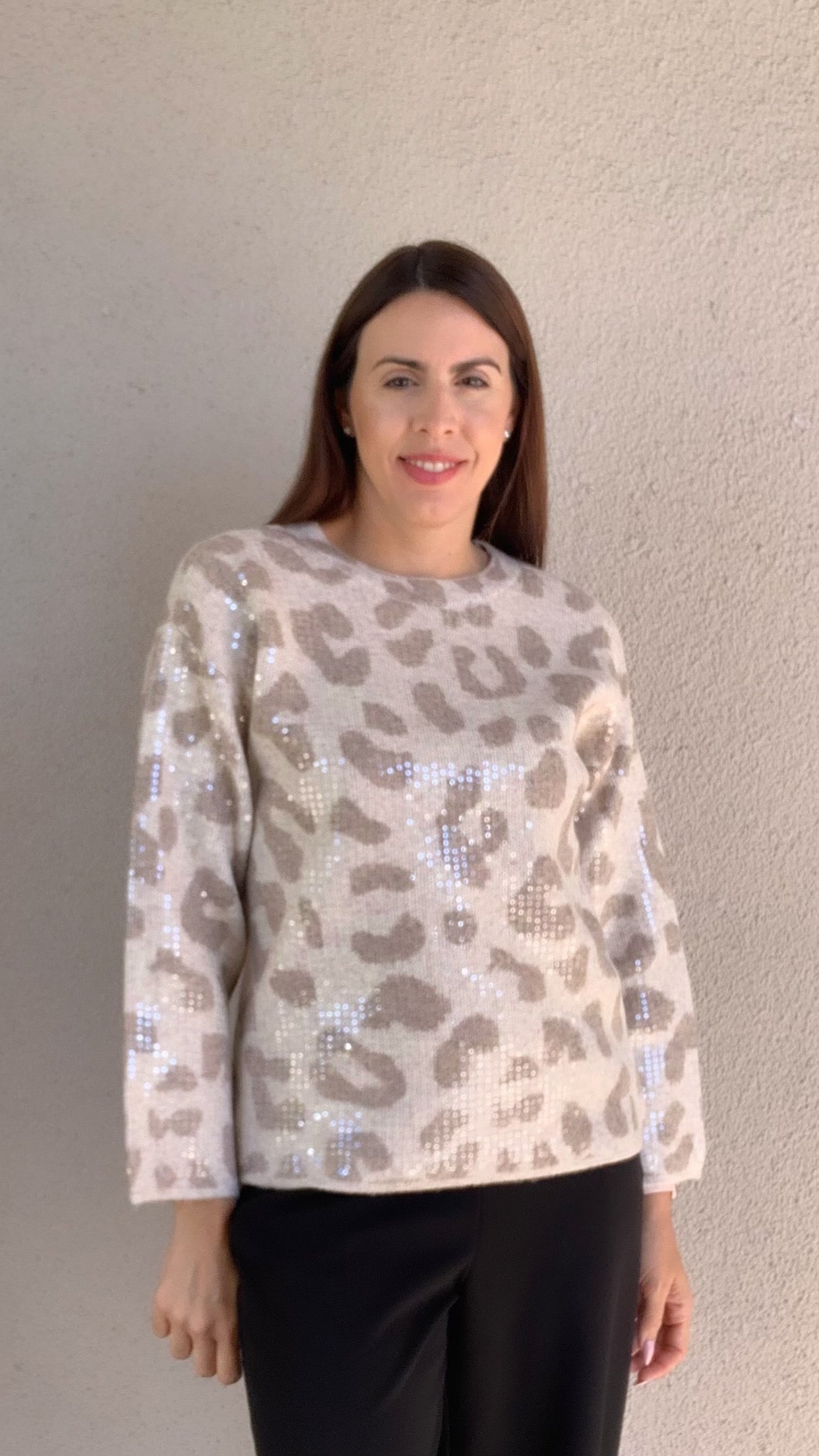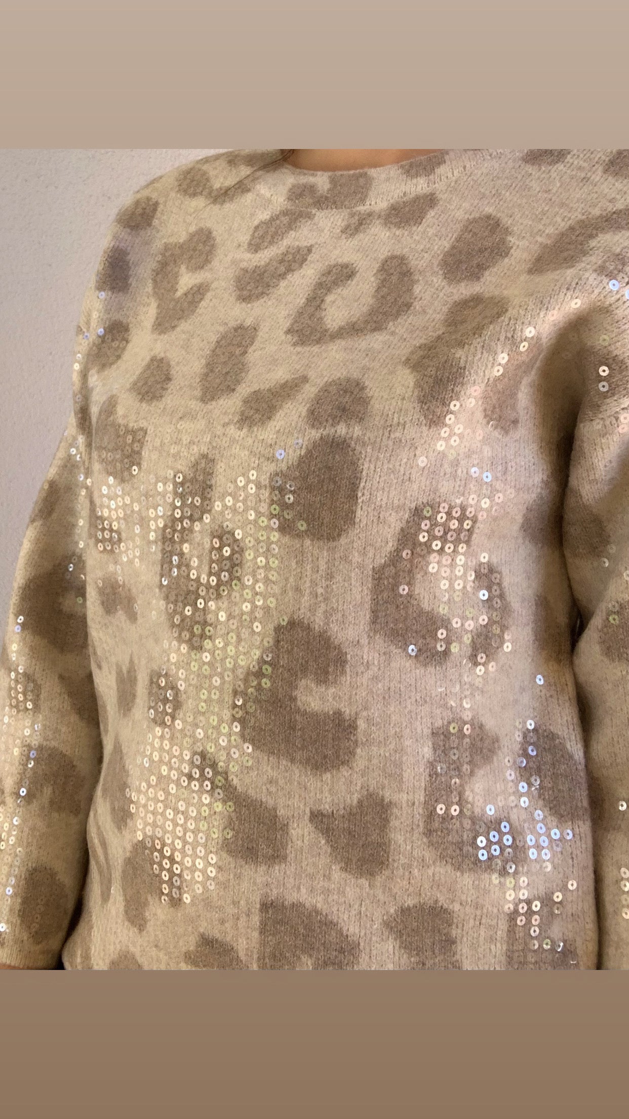 Elevate your style with this Animal Print Long Sleeve Crew Neck Sequin Sweater. Featuring shimmering sequins and a bold animal print, it effortlessly combines edgy flair with cozy comfort. Perfect for making a statement at any event, its soft fabric and classic crew neck ensure you stay comfortable while turning heads. Add a touch of sparkle to your wardrobe and stand out with confidence wherever you go.
