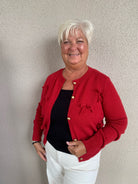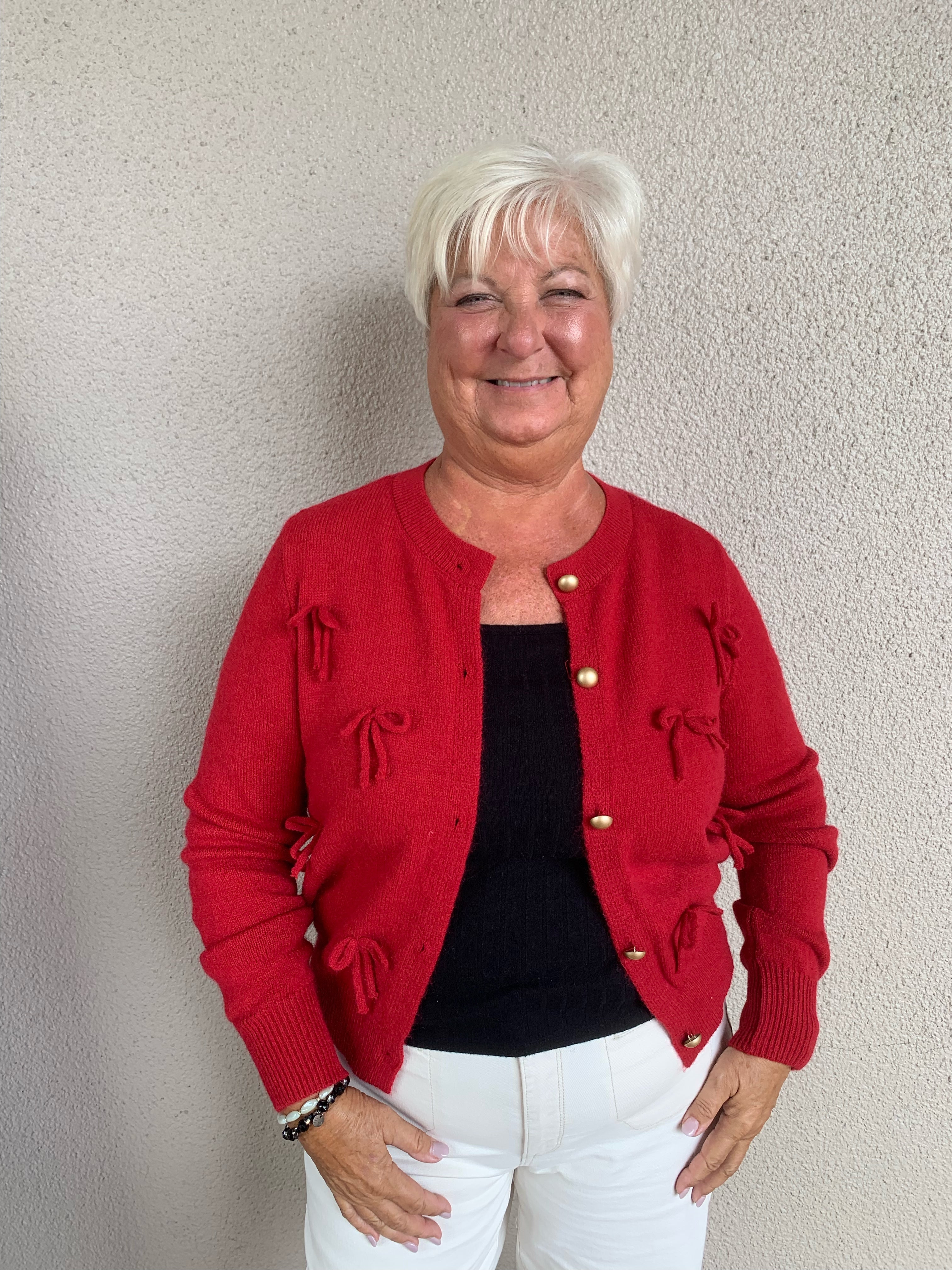 Button Front Knit Cardigan with All Over Bow Detail Elevate your everyday style with this charming knit cardigan, featuring a classic button-front closure and delightful bow embellishments scattered throughout. The soft, versatile knit fabric drapes beautifully, making it perfect for layering over dresses, tees, or tanks. Whether you're dressing up for brunch or keeping it casual at home, this cardigan effortlessly transitions from season to season. The thoughtful bow details add a touch of feminine sophistication that sets it apart from basic layers. A wardrobe essential that combines comfort with undeniable charm.