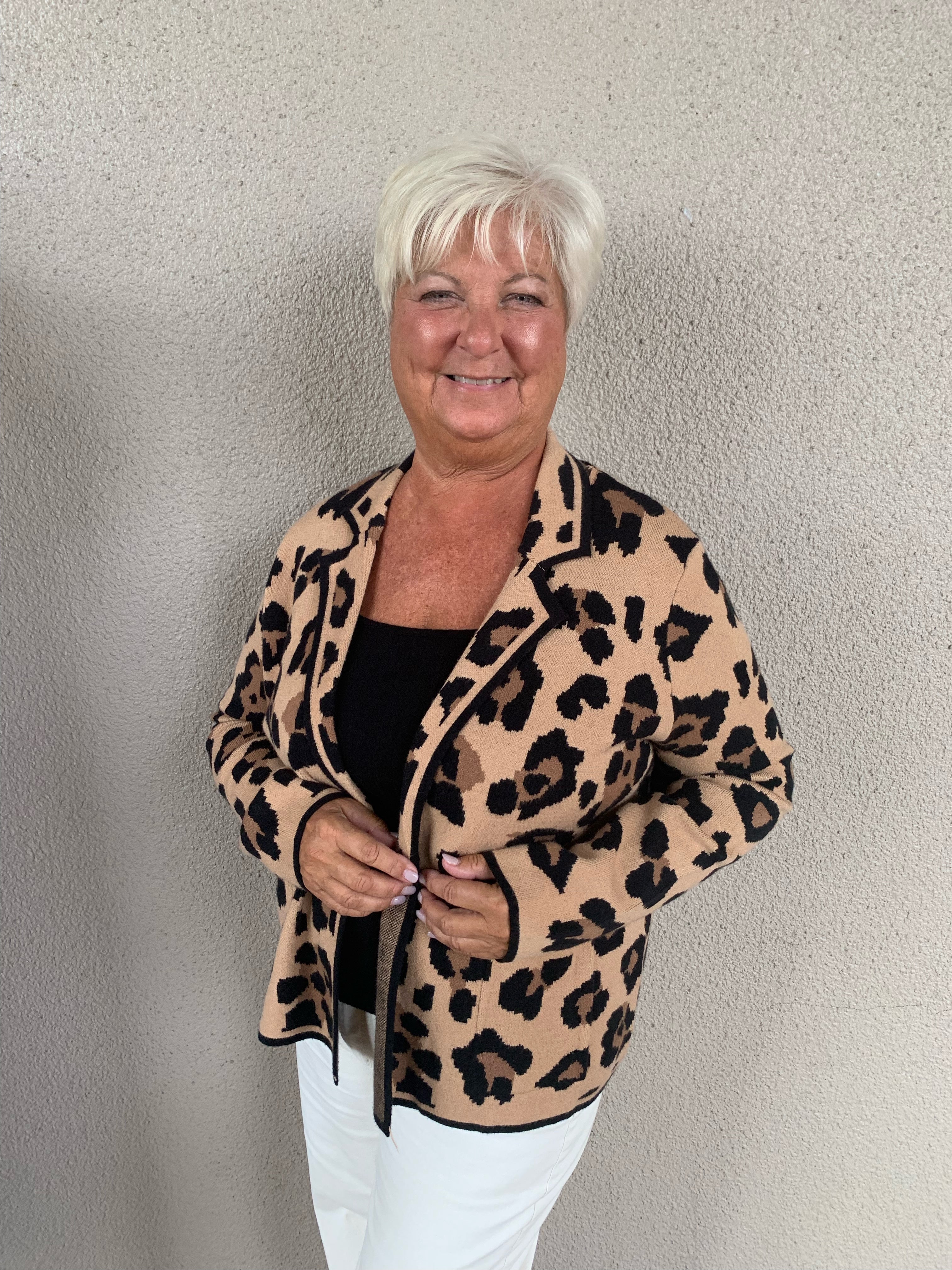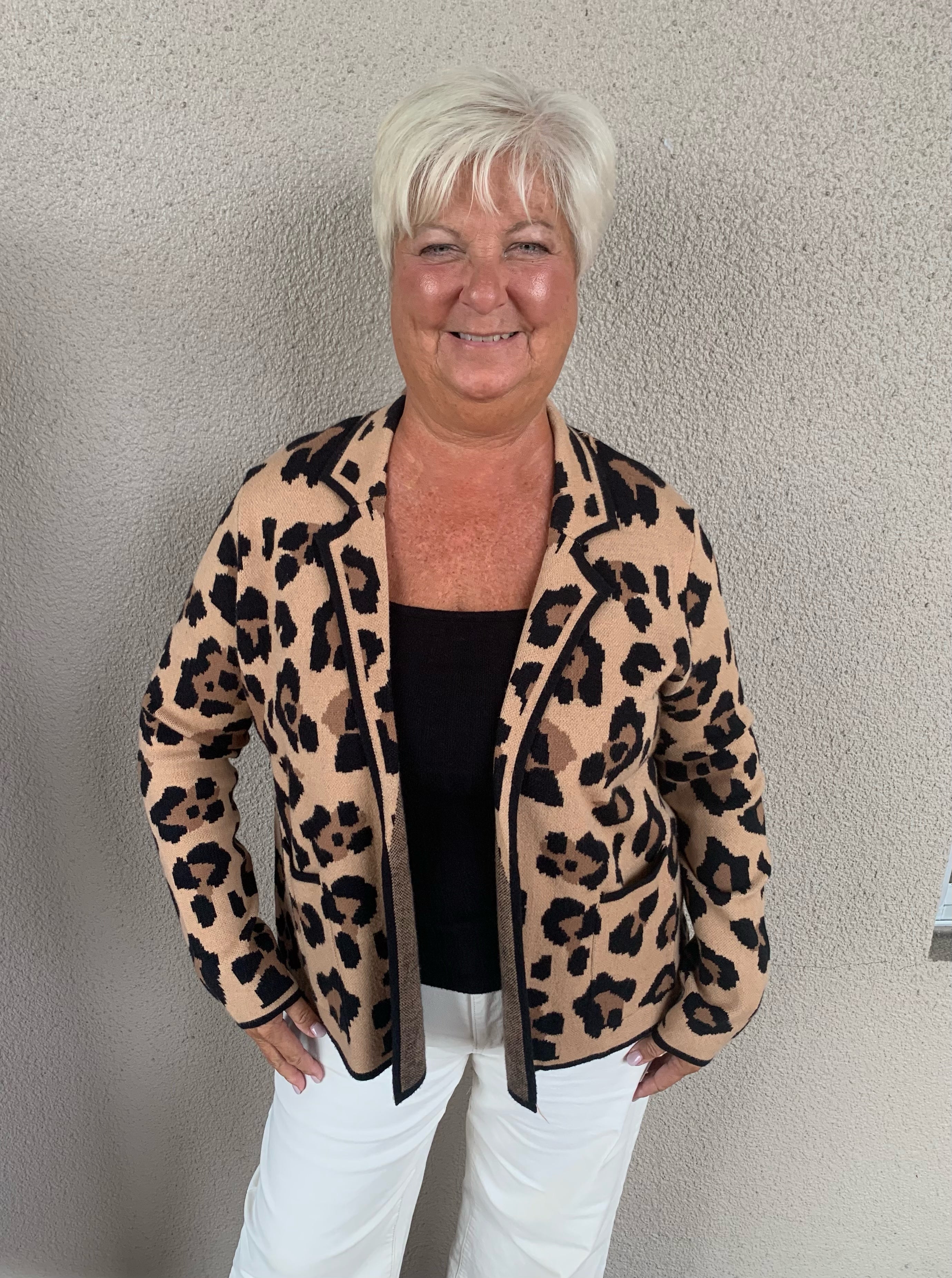 Elevate your wardrobe with this striking leopard print tuxedo style sweater jacket—a bold fusion of classic tailoring and contemporary edge. The refined tuxedo silhouette delivers polished sophistication, while the eye-catching leopard print adds personality and flair to any outfit. Perfect for layering over basics or dressing up casual pieces, this versatile jacket transitions seamlessly from day to night. Whether you're heading to the office, a night out, or weekend brunch, this statement piece ensures you'll stand out with confidence and style.