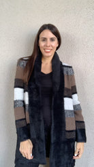 Experience the chic blend of a coat and cardigan with this stunning mid-length coatigan. Designed to transition seamlessly from balmy nights to evening chills, it’s perfect for layering. Featuring a luxe faux fur shawl collar and a stylish colorblocked pattern, this piece adds sophistication and warmth to any outfit. Pair it effortlessly with denim, trousers, or leggings for a versatile, elevated look.