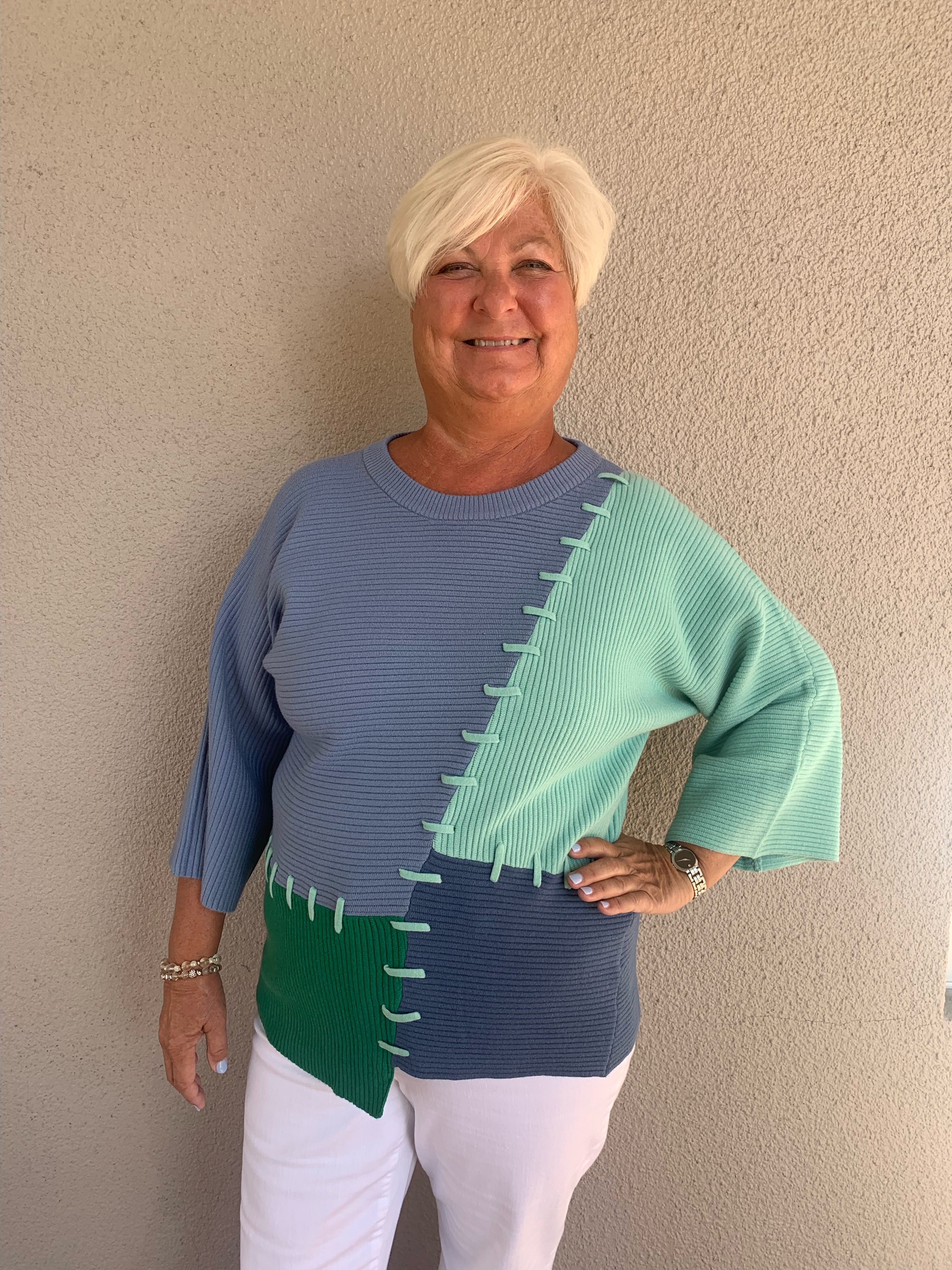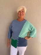 This stunning Color Block Pullover brings together vibrant shades and a laid-back feel, perfect for any casual outing. Crafted from a comfortable blend of viscose, polyester, and nylon, it features an eye-catching color-block design with light and dark blues and green, complemented by bold blue stitching for an extra touch of style. The pullover’s relaxed fit ensures all-day comfort, making it an ideal choice for a casual brunch or a laid-back weekend. Style it with your favorite jeans for an effortlessly chic, breezy look.
