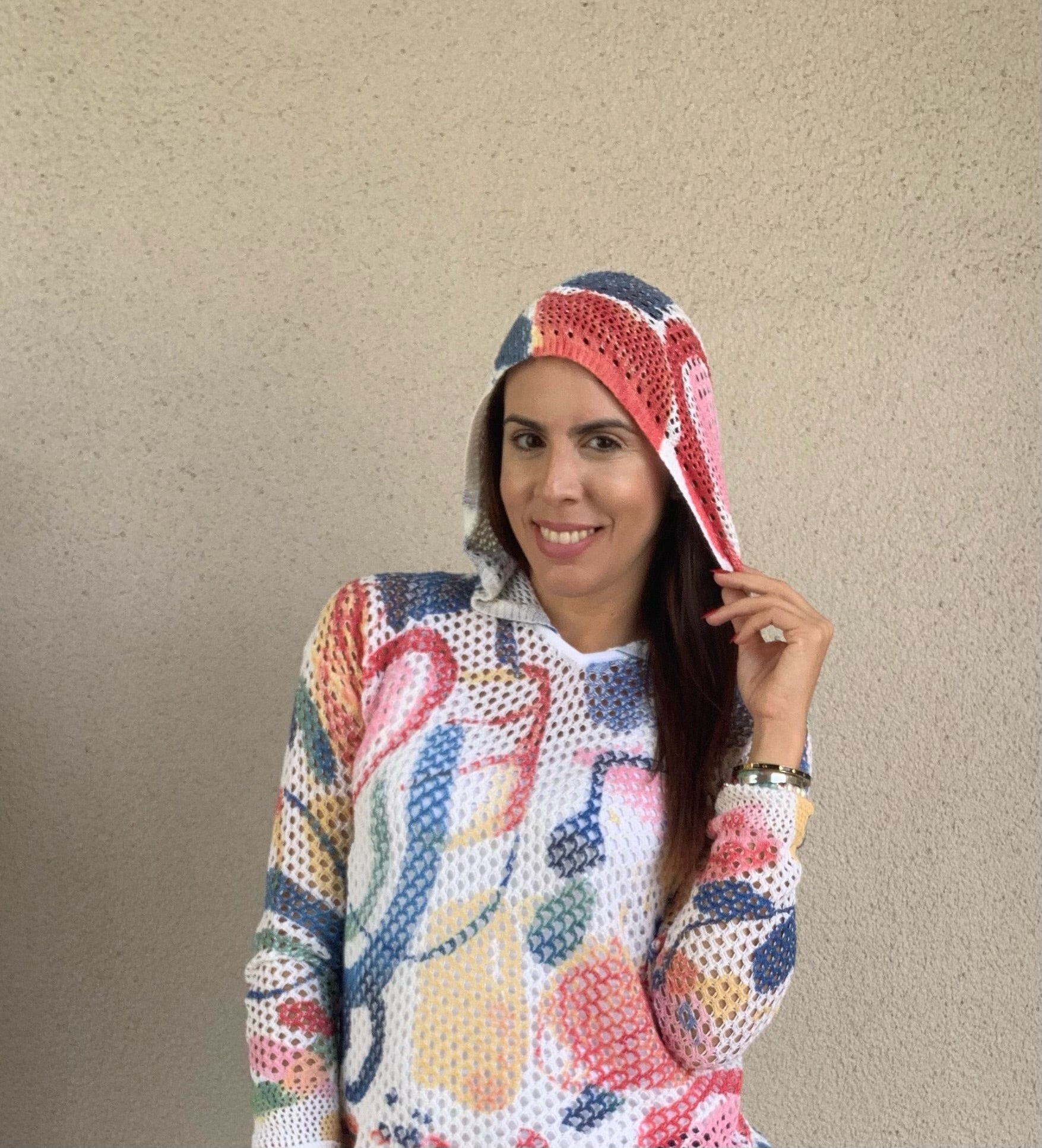 Elevate your casual wardrobe with this Printed Cotton Blend Crochet Fishnet Hoodie Sweater. Crafted from a breathable cotton blend, its intricate crochet fishnet design offers a stylish, airy feel perfect for layering. The attached hoodie adds a sporty edge while providing extra comfort and coverage. Ideal for transitional weather, this sweater combines fashion and function effortlessly, making it a versatile piece for any season.