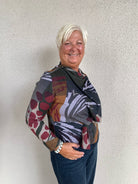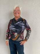 Printed Drape Neck Long Sleeve Light Sweater with Front Loop Detail