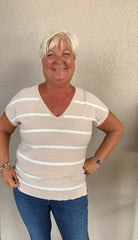 Elevate your daily wardrobe with this V-Neck Striped Extended Short Sleeve Sweater. Designed for comfort and style, its flattering V-neck and extended short sleeves offer a modern twist on a classic look. The subtle stripes add visual interest, making it perfect for both casual outings and relaxed office days. Crafted to keep you comfortable all day, this sweater effortlessly blends versatility with a chic edge.