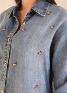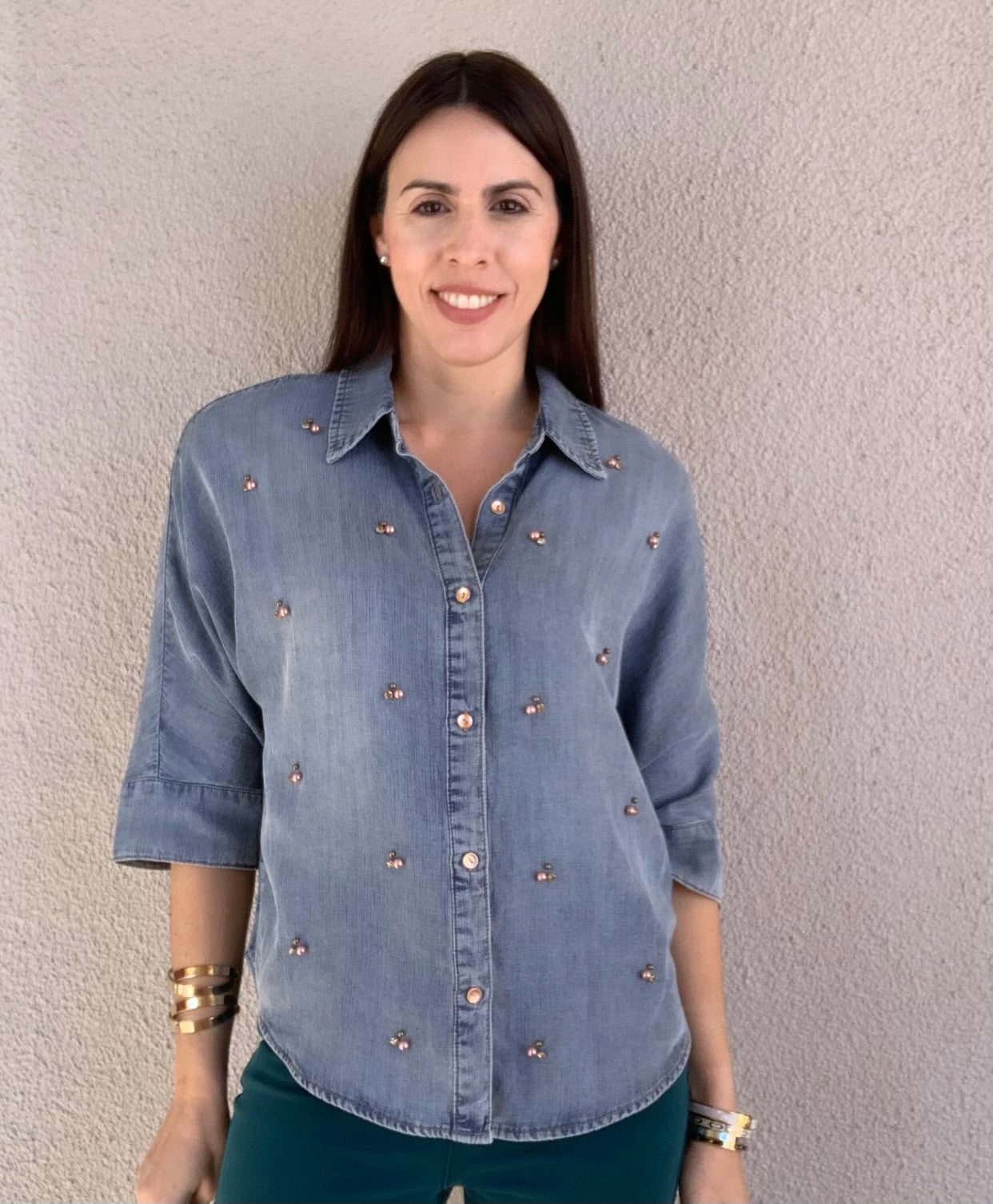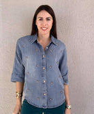 3/4 Sleeve Button Front Embellished Woven Top