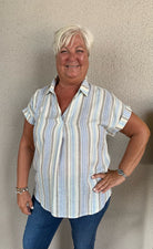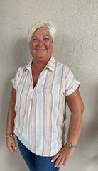Collared Short Sleeve Blouse with Pleated Center & Vertical Stripe Detail