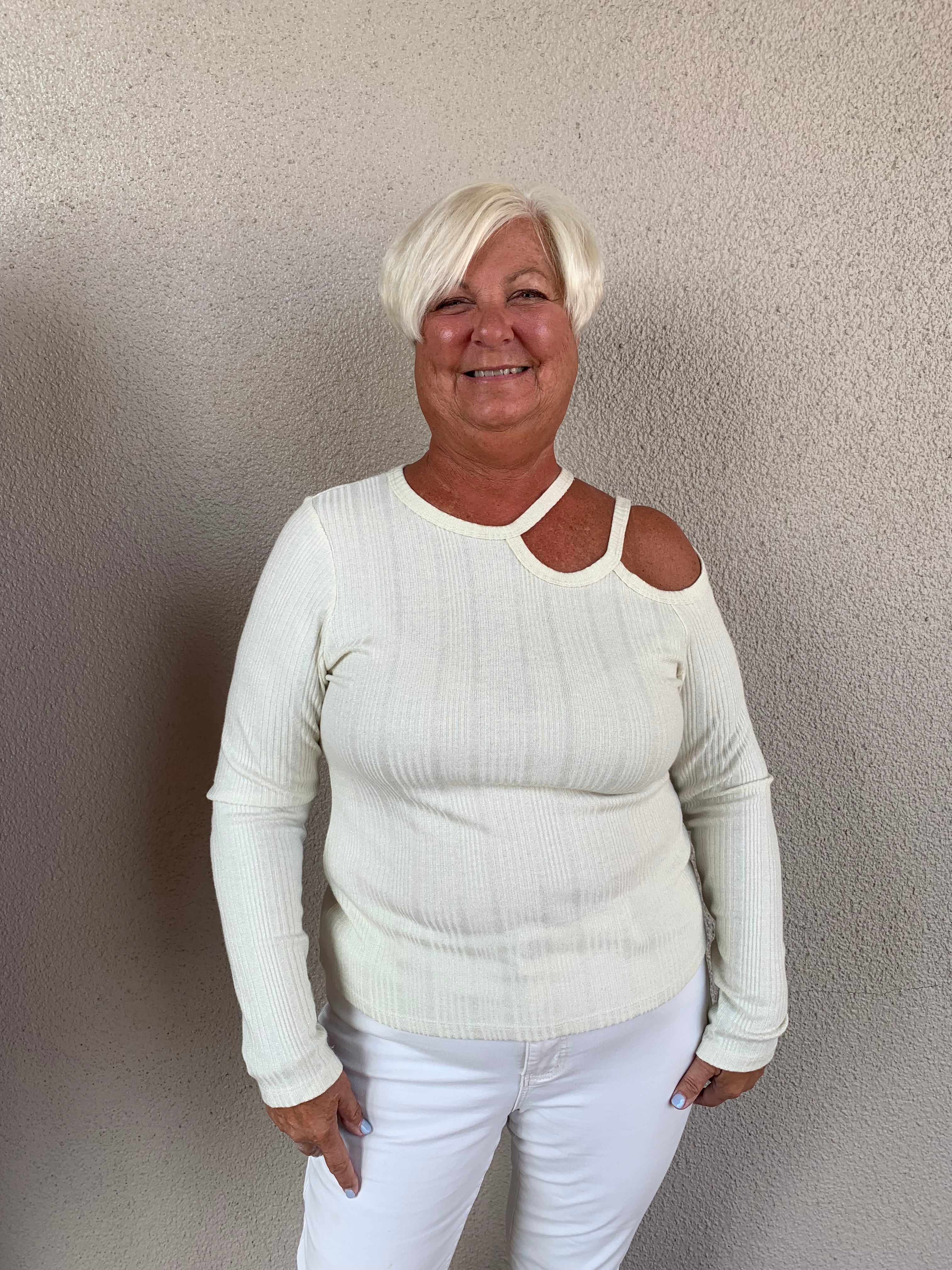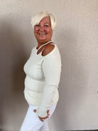 Shoulder Cutout Long Sleeve Top keeps you looking pretty and polished. Featuring a chic shoulder cutout and a classic crew neck, this top combines elegance with a hint of playful edge. Its ribbed, shimmery knit fabric offers both texture and shine, making it an effortlessly fun yet refined piece for any occasion.