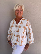 Embroidered Palm Tree Button Down Blouse with Front Tie