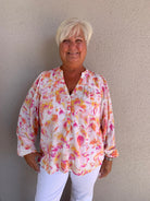 The Floral Print V-Neck Button-Front Blouse is a perfect blend of femininity and effortless sophistication. Crafted from lightweight, breathable fabric, this blouse features a delicate floral print that adds a touch of charm to any outfit. The V-neckline creates a flattering silhouette, while the button-front detail enhances its classic appeal. Designed with a relaxed yet polished fit, this versatile piece pairs beautifully with jeans for a casual-chic look or tailored trousers for a more refined ensemble.