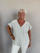 Flutter Sleeve Button Front Stripe Top with Eyelet Detail