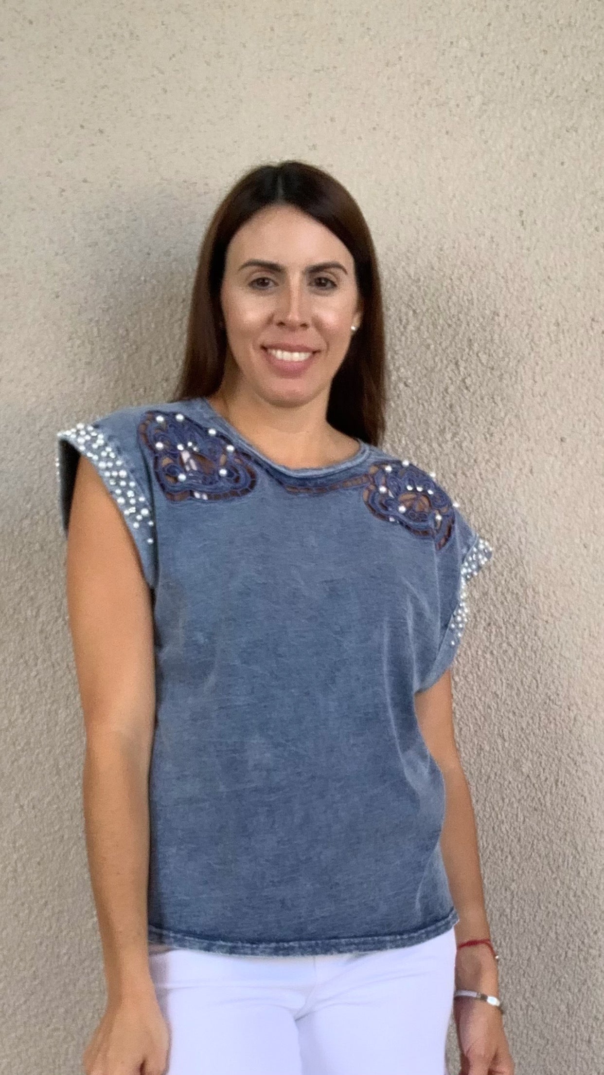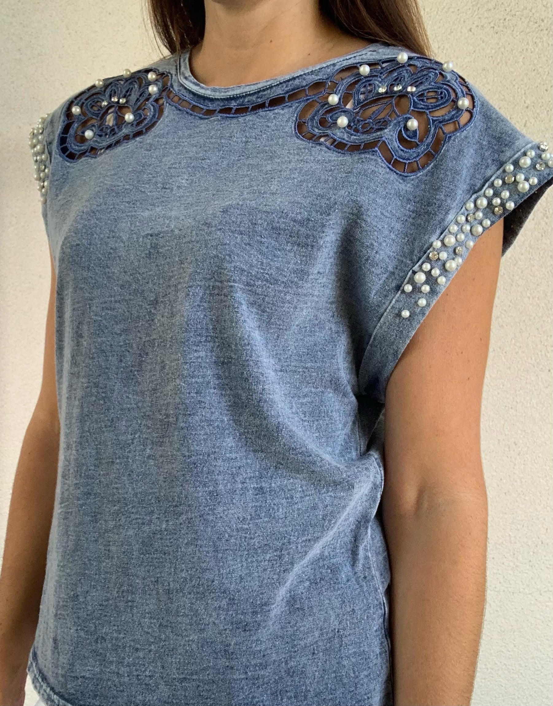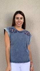 Lace & Rhinestone Knit Drop Shoulder Tee