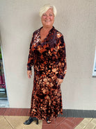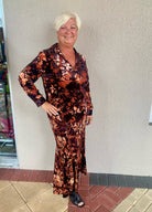 This elegant button-up shirt captures the vibrant allure of a blazing fire opal, featuring long sleeves and a captivating print that exudes warmth and luxury. With its rich color palette and sophisticated design, it’s a statement piece ideal for any special occasion. Pair it with the matching skirt and heels for an effortlessly chic, elevated look that’s sure to turn heads.