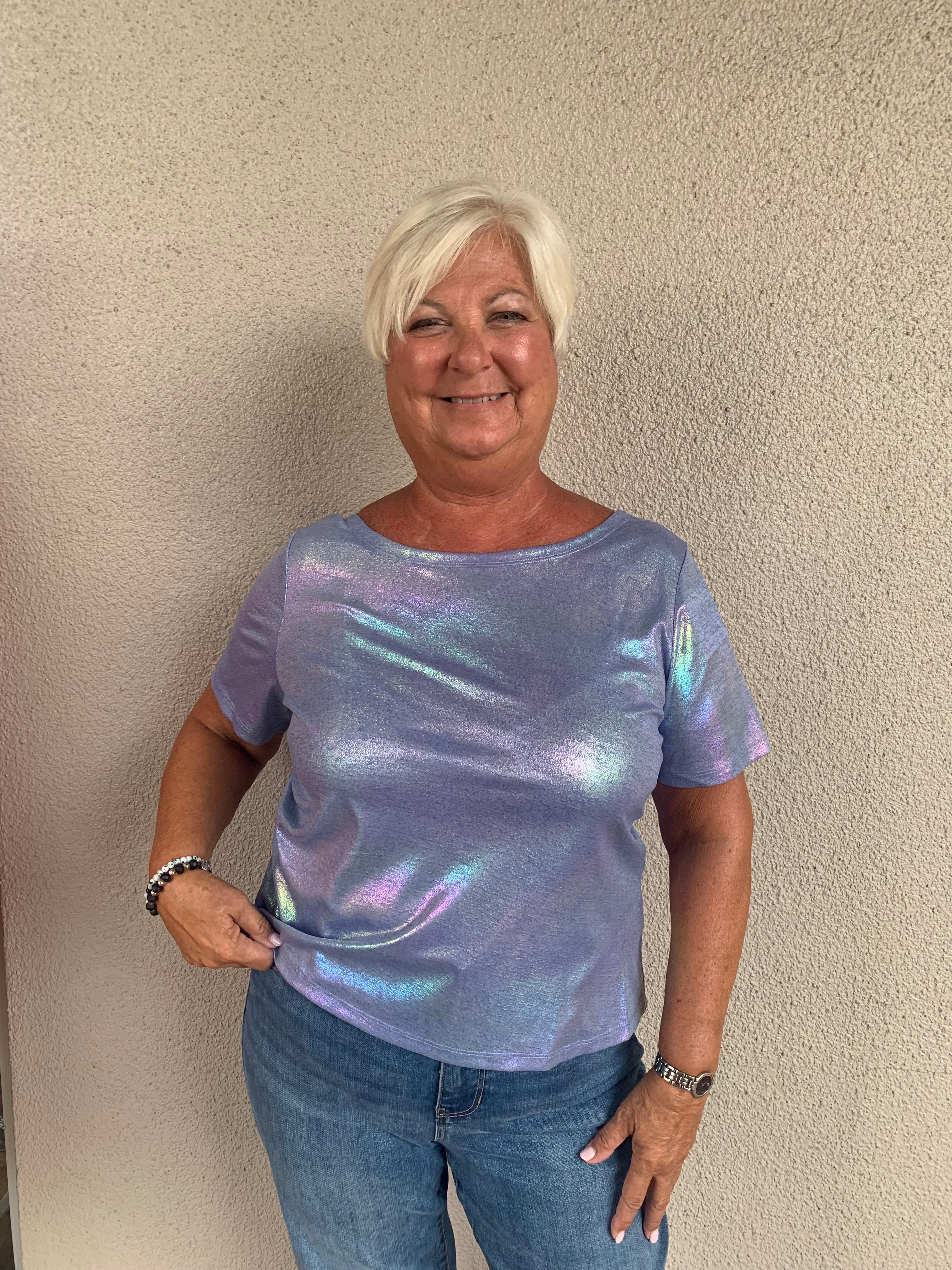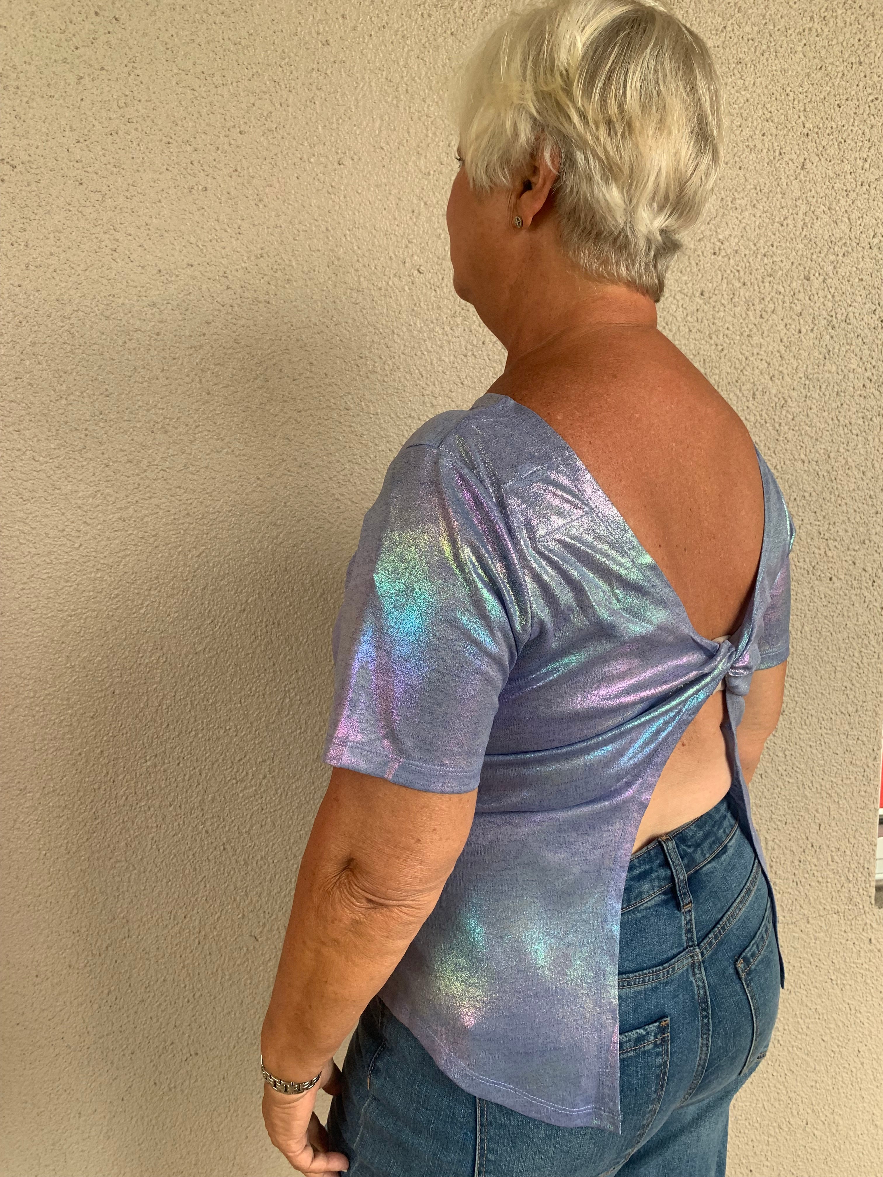 Turn heads from every angle in the Open Back Iridescent Tee — a playful twist on a classic silhouette with a shimmering, modern edge. Crafted from a soft, lightweight fabric with a touch of stretch, this tee catches the light with its subtle iridescent finish, making it perfect for adding a hint of glam to your everyday look.