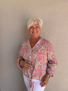 Effortlessly chic with a touch of bohemian charm, this Paisley Printed V-Neck Blouse is a must-have for your wardrobe. Crafted from lightweight 100% viscose, it drapes beautifully for an easy, flowy fit. The elegant V-neckline and front tie detail add a feminine touch, while the long sleeves offer versatility for year-round styling. Perfectly paired with denim or tailored bottoms, this blouse brings timeless elegance to any look.