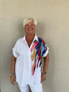 Versatile, artistic, and effortlessly chic—the Placement Print Short Sleeve Dolman Shirt is designed for style that moves with you. Crafted from a breathable blend of rayon and linen, this shirt features a soft, airy drape and a bold placement print that makes a statement without saying a word. The relaxed dolman sleeves and easy silhouette bring casual elegance, while its convertible design offers two distinct ways to wear—style it open as a lightweight layer or buttoned-up as a polished top.