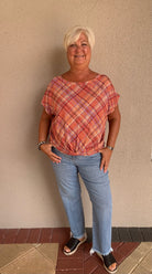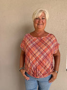 Classic meets contemporary in the Plaid Crew Neck Knit Top with Twist Front Detail. Featuring a timeless plaid pattern and a soft, stretch-infused knit, this top is designed for all-day comfort with a polished edge. The twist front detail adds a flattering, fashion-forward touch that creates subtle shape and visual interest, while the crew neckline keeps the look clean and versatile.