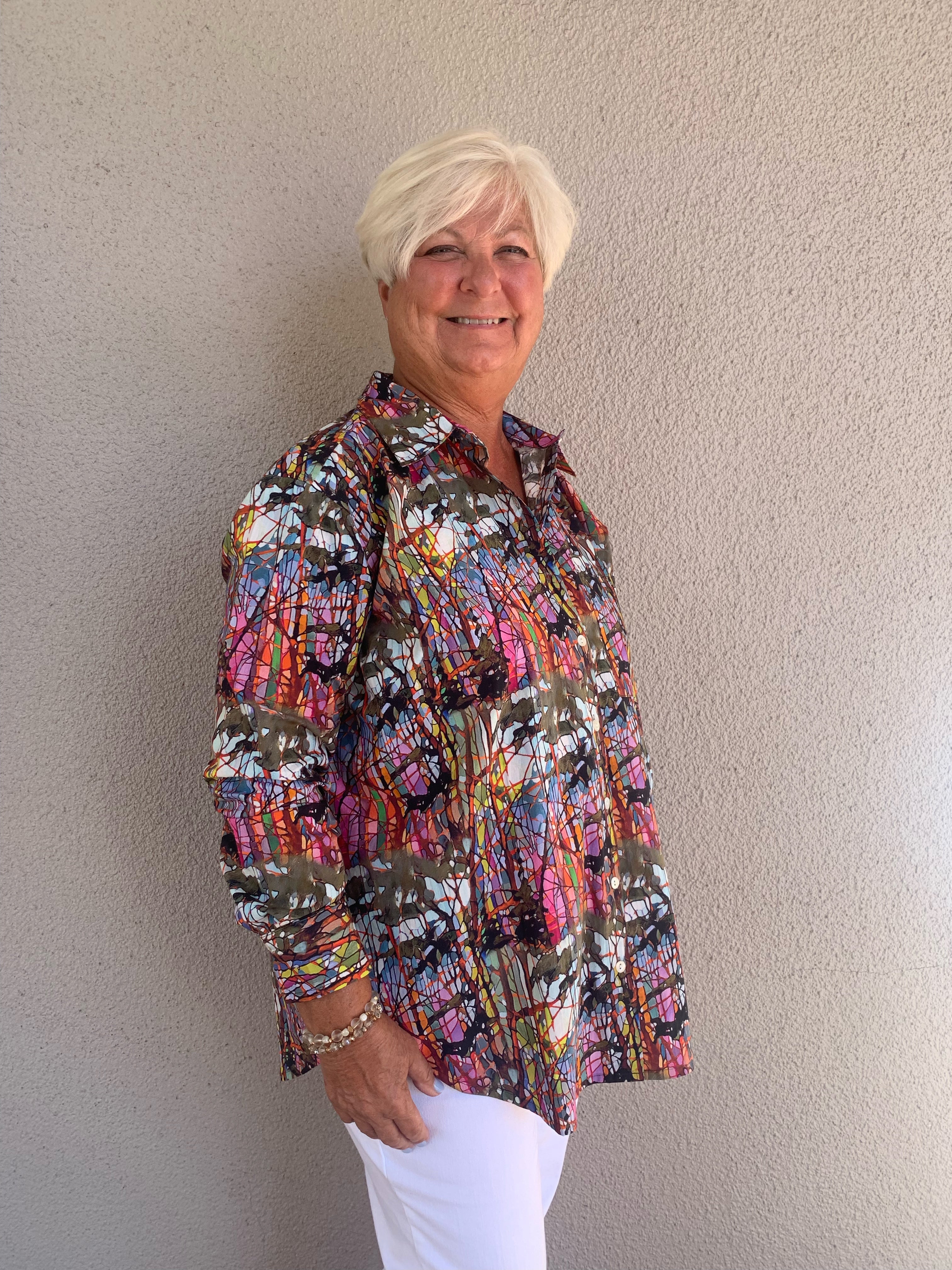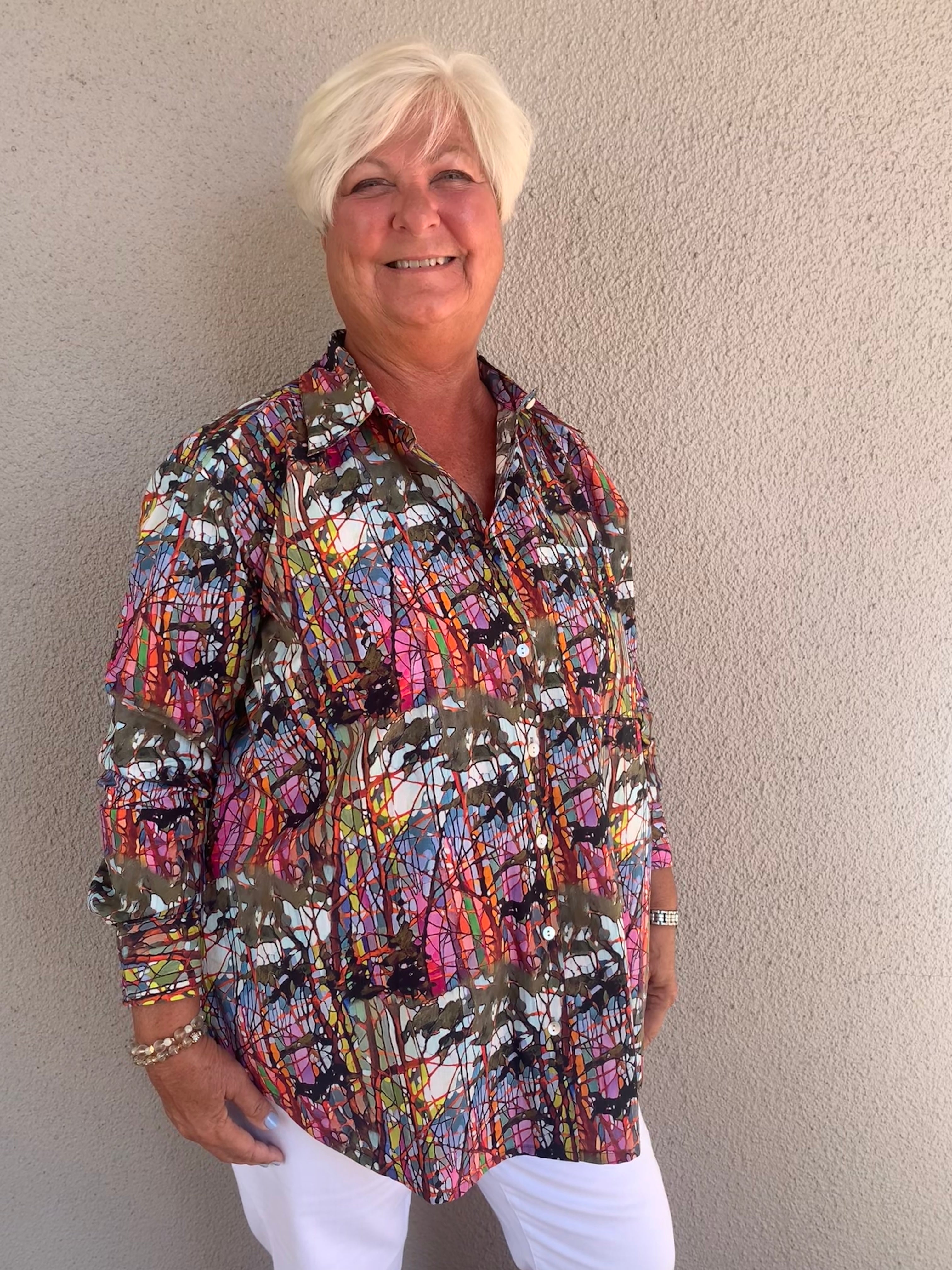 This stunning Boyfriend Fit Button-Up Shirt combines a playful mix of colors with a relaxed, easygoing fit that radiates positivity. Crafted from soft, breathable fabric, it offers all-day comfort and effortless style. With its classic button-up design and striking pattern, this versatile shirt transitions seamlessly from casual to polished looks, making it perfect for any occasion. Dress it up with tailored pants or keep it laid-back with jeans—this shirt is designed to make a vibrant statement wherever you go.