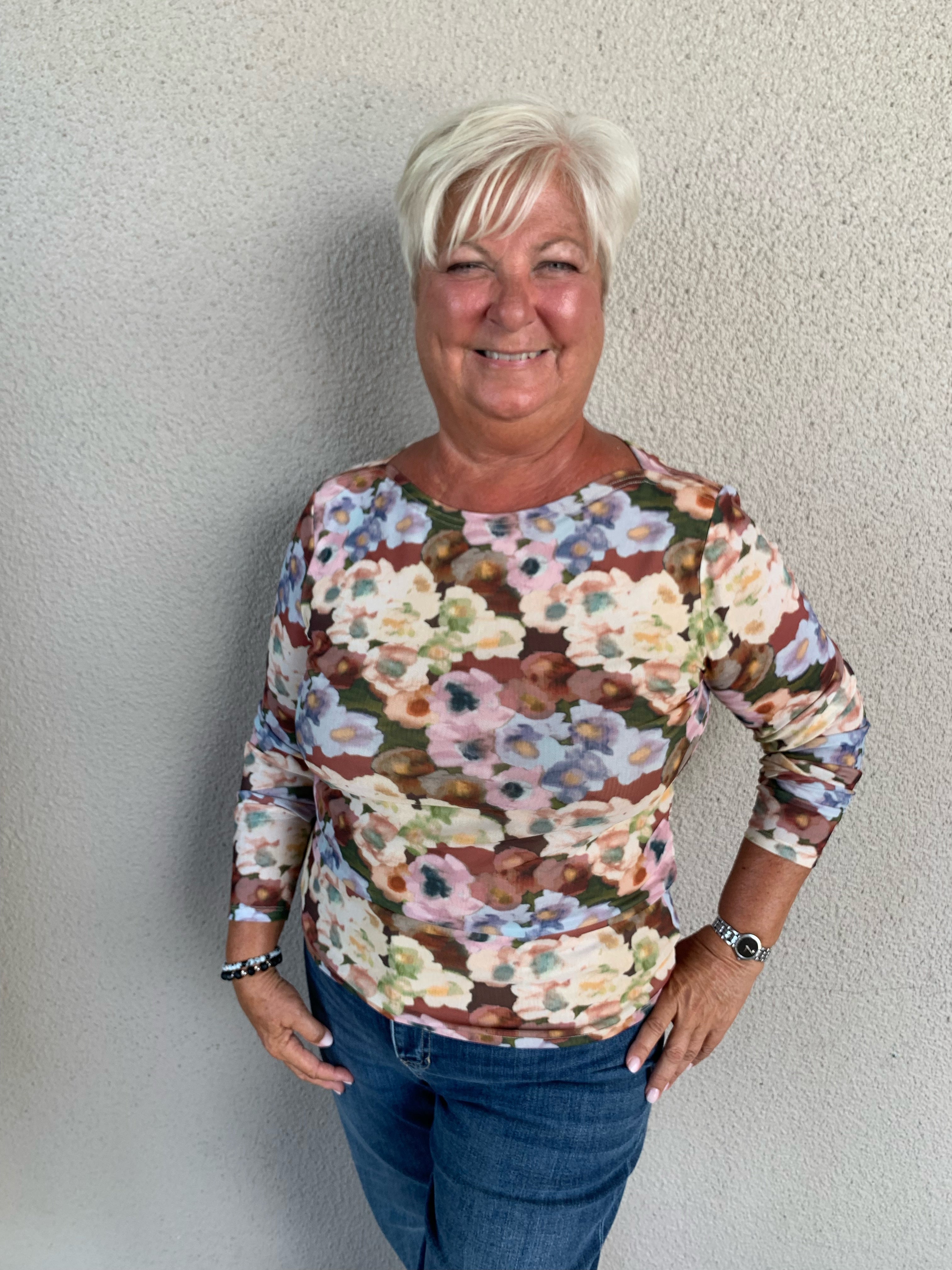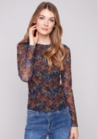 Printed Long Sleeve Mesh Top with Lining and Side Ruching