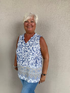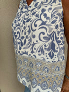 This Sleeveless Printed Ruffle Neck Blouse is the perfect balance of playful elegance and effortless style. Made from 100% rayon, it offers a soft, fluid feel with just the right amount of drape. The delicate ruffle neckline adds a feminine touch, while the all-over print brings a pop of color and visual interest. With its sleeveless cut, this blouse is ideal for layering or wearing solo, making it a versatile piece that easily transitions from day to night.