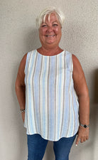 Round Neck Sleeveless Top with Keyhole Button Back & Vertical Stripe Print