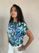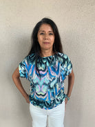 Add a pop of modern flair to your wardrobe with the Short Sleeve Boat Neck Printed Knit Top. Featuring a dynamic blue and black multi print, this top exudes effortless style. The boat neckline lends a touch of elegance, while ruched sides create a flattering silhouette that complements every shape. Perfect for layering or wearing on its own, this versatile piece pairs seamlessly with tailored pants or casual jeans for any occasion.