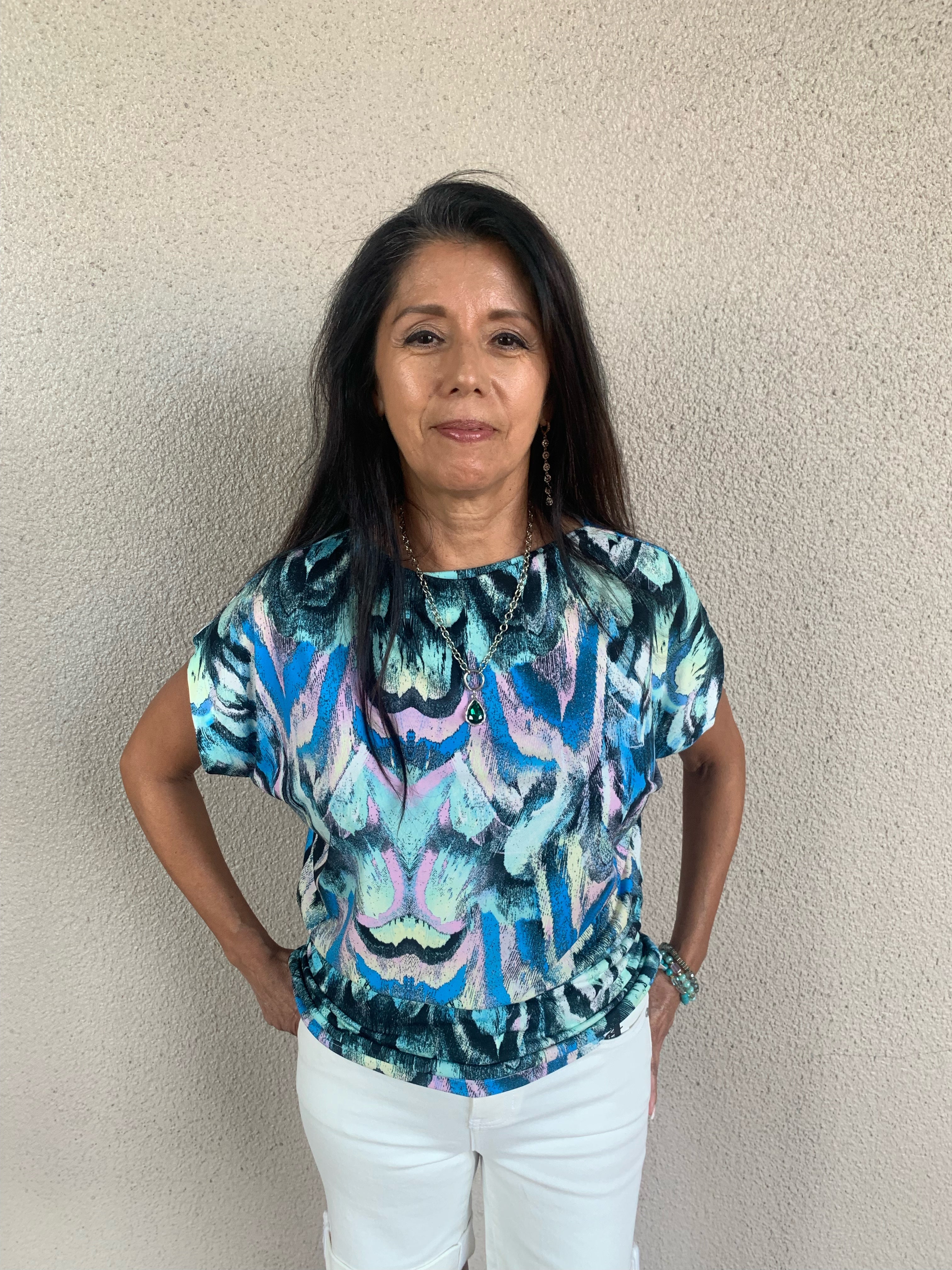 - Fabric: Soft, breathable knit with a bold multi-color print