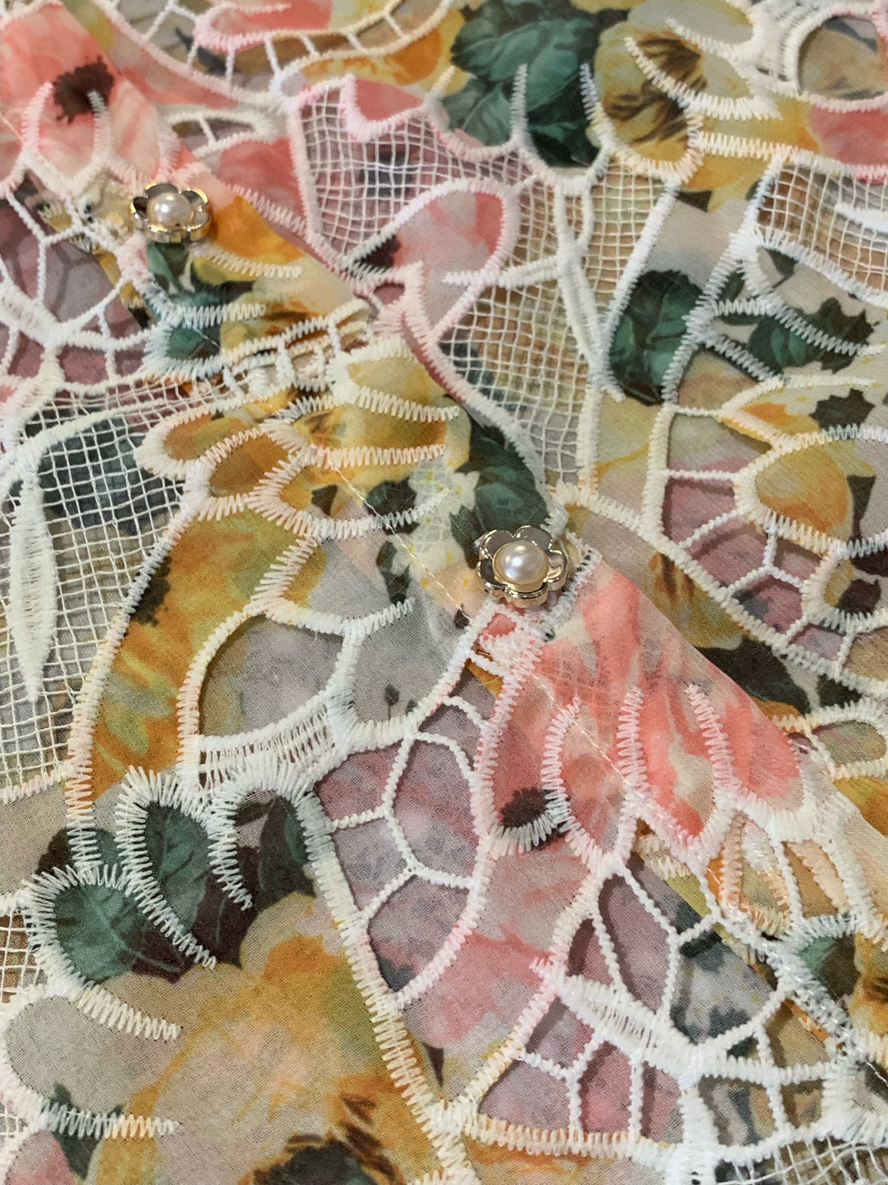 Short Sleeve Colorful Crochet Button Down Shirt with Pearl Button Detail