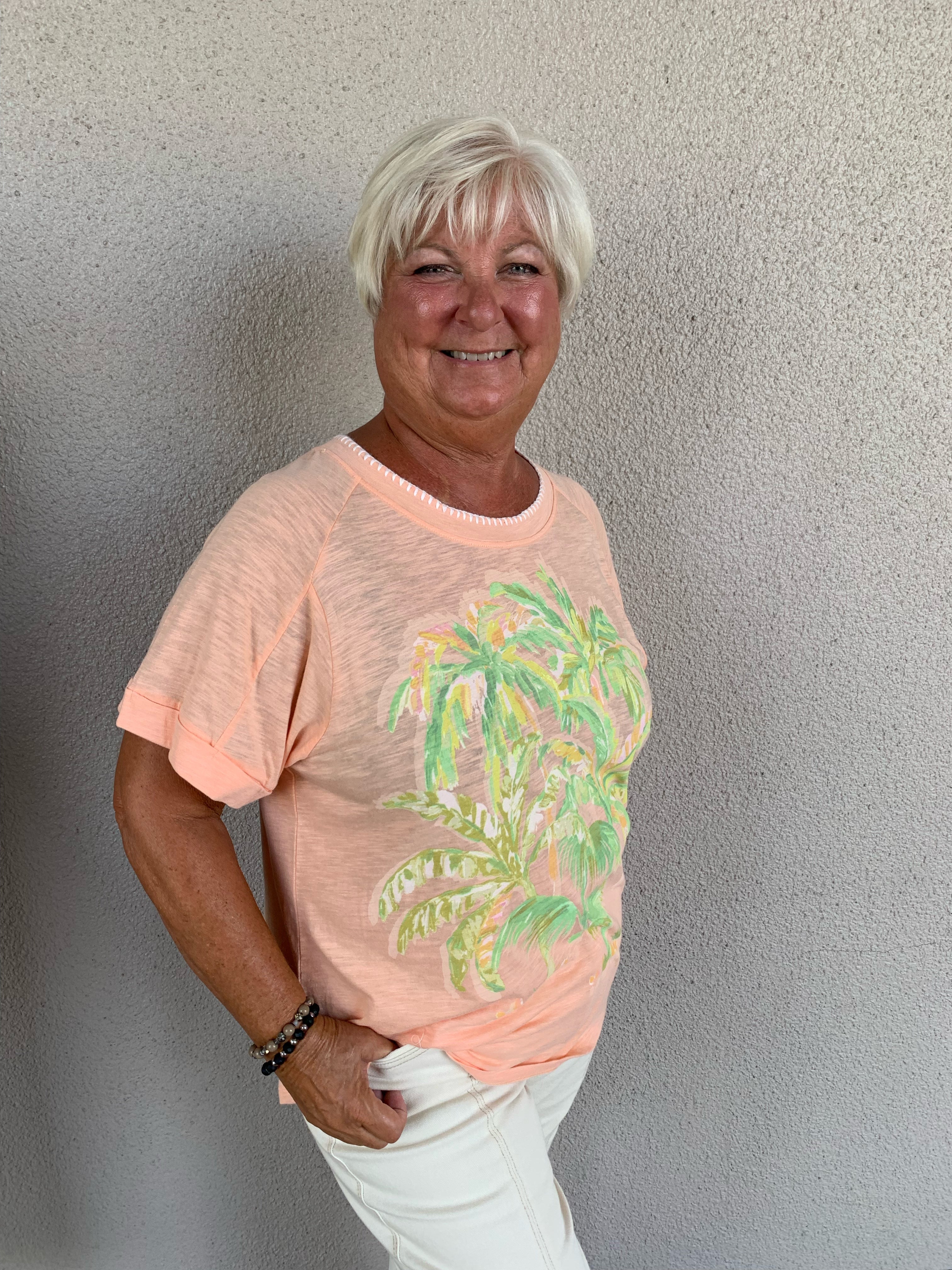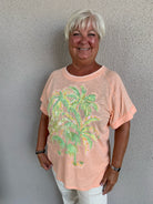 Bring the vacation vibes wherever you go with this laid-back screen-printed knit boyfriend tee. Featuring vibrant palm tree artwork accented with delicate embroidery, it captures the essence of sunny getaways. The relaxed silhouette, scoop neckline, and short roll cuff sleeves keep things effortlessly cool—perfect for tossing on with your favorite shorts or denim for a carefree, casual look.