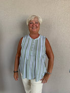 Sleeveless Pop-Over Button Front Top with Pintucks & Vertical Stripe Print