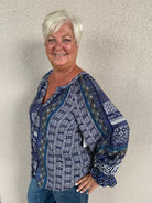 Elevate your wardrobe with this 3/4 Sleeve Multi Print Button Front Blouse, crafted from 100% rayon for a soft, breathable feel. Its vibrant mixed prints add a stylish edge, while the button-front design offers versatile wear options. Perfect for both casual outings and office days, this blouse combines comfort and fashion effortlessly.