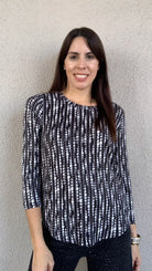 Add a touch of timeless charm to your wardrobe with our 3/4 sleeve top, featuring a captivating black-white dot stripe print. Designed with both comfort and versatility in mind, this piece effortlessly transitions from casual days to elevated evenings. Its soft, stretchy fabric ensures a flattering fit, making it the ultimate wardrobe staple.