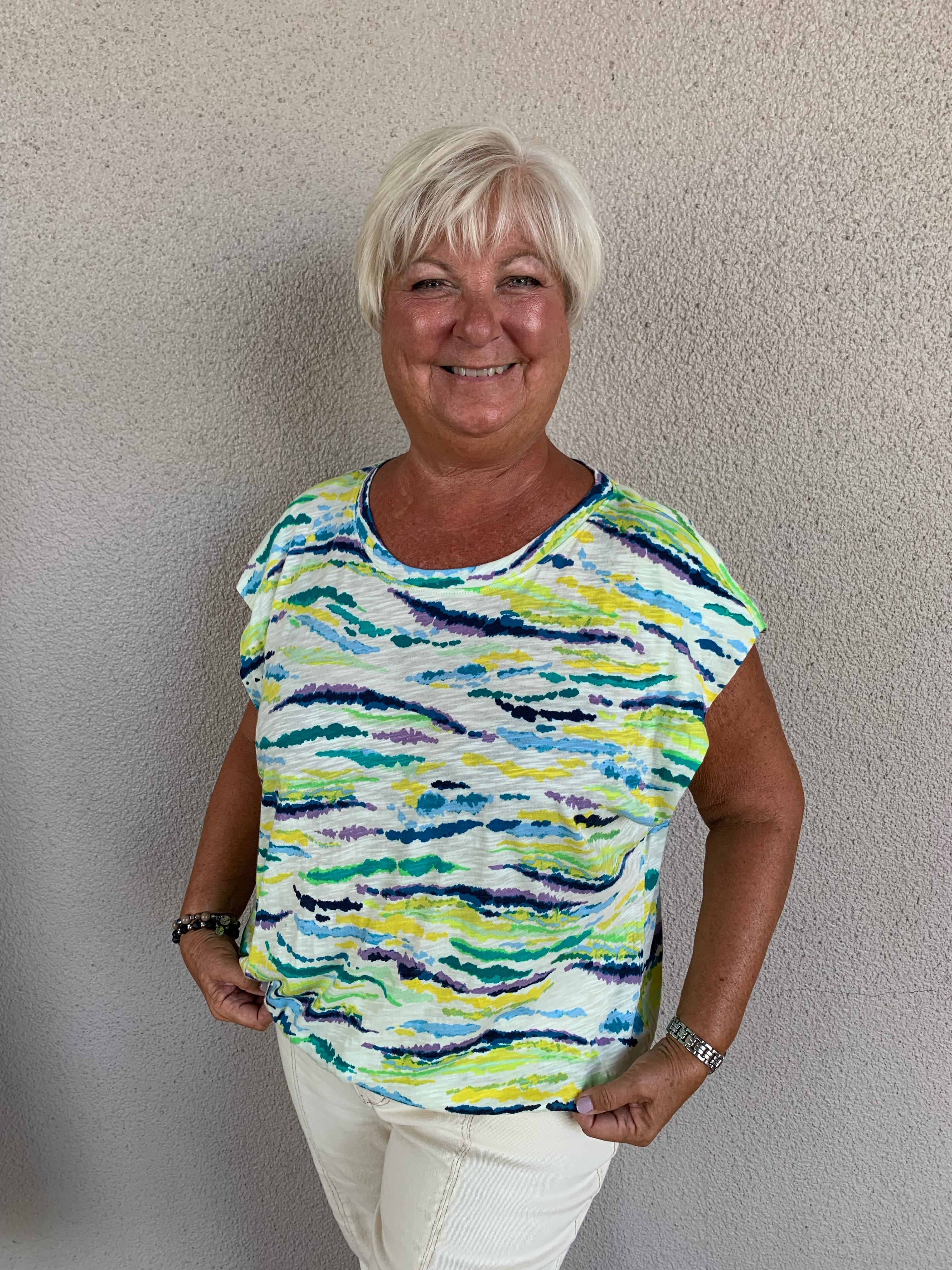 Make a statement in this bold printed knit top, designed to energize your wardrobe with its vibrant, color-forward abstract pattern. Featuring sculptural origami cap sleeves and a flattering scoop neckline, it brings a touch of modern artistry to everyday style. The cased hem creates a gently bloused effect for a polished yet easy silhouette that moves with you from day to night.