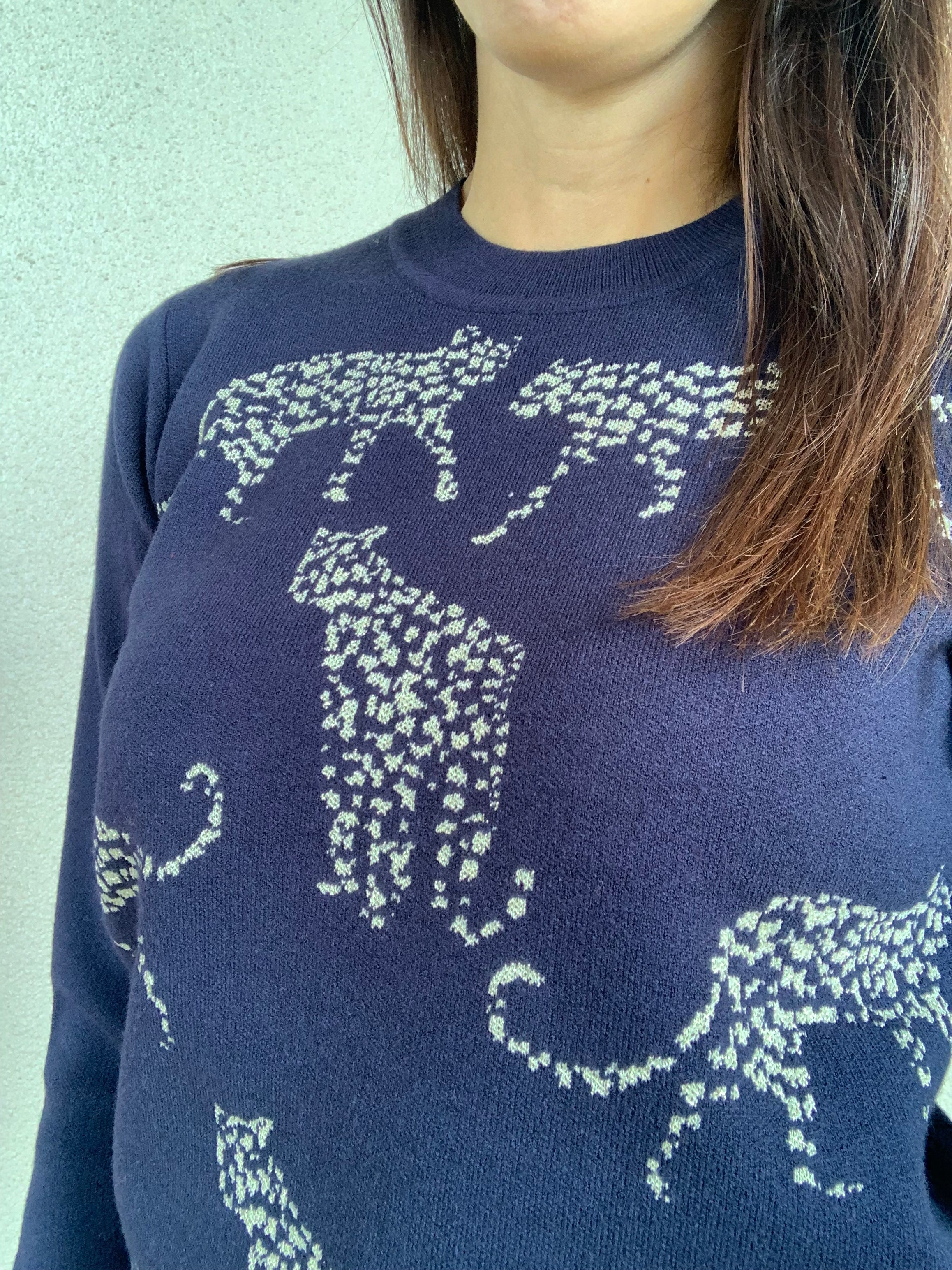- Neckline & Style: Classic crew neck with a playful cheetah pattern