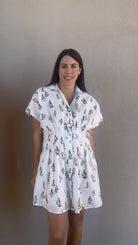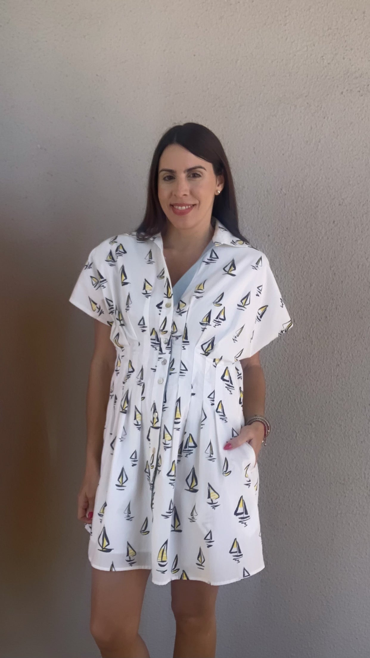 Button Front Short Sleeve Sailboat Print Dress with Pockets Effortless coastal charm meets everyday practicality in this breezy button-front dress. The cheerful sailboat print captures a relaxed, nautical aesthetic perfect for warm-weather outings, while functional pockets add genuine convenience to your wardrobe. Short sleeves keep you cool and comfortable, and the classic button front allows easy layering or styling adjustments throughout the day. Whether you're heading to brunch, running errands, or enjoying casual weekend plans, this versatile piece transitions seamlessly from day to evening. A timeless addition that combines style with wearability.