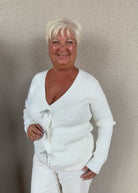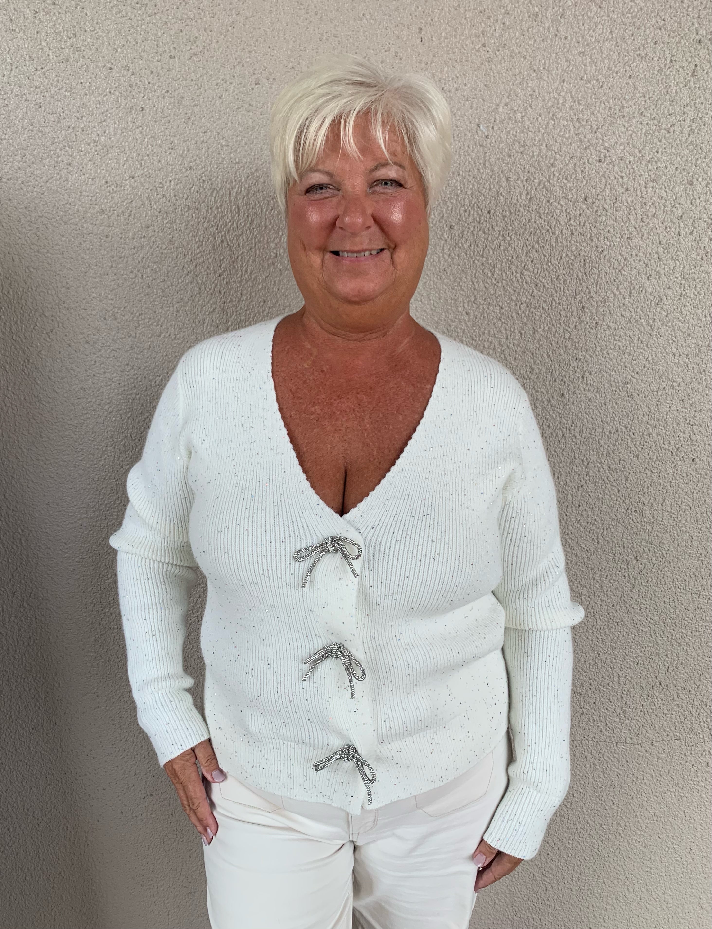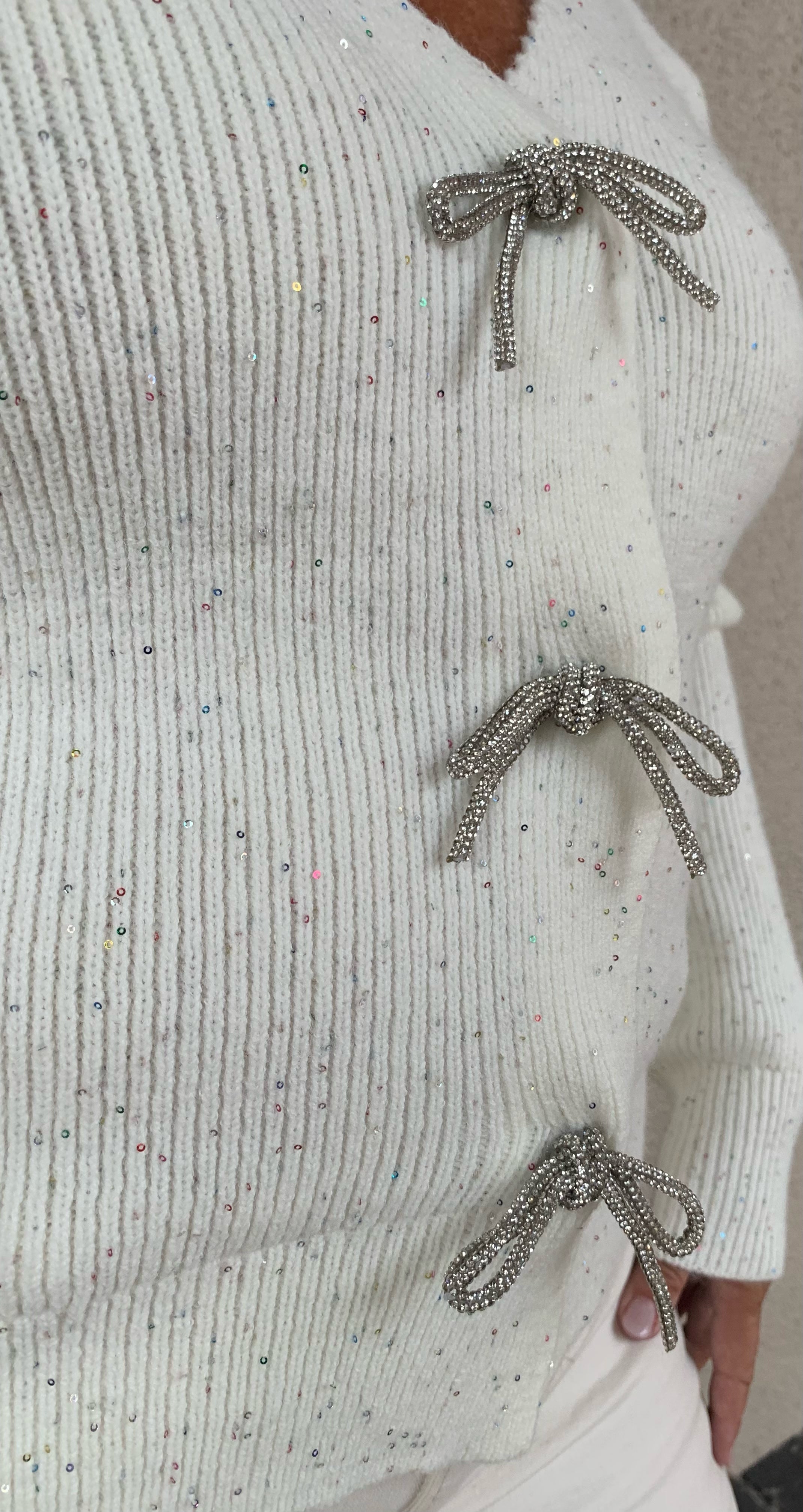 Elevate your everyday style with this sophisticated cardigan featuring an eye-catching embellished bow detail. The refined bow accent adds a touch of elegance and personality, making it perfect for layering over dresses, tees, or tanks. Crafted for comfort and versatility, this piece transitions seamlessly from casual outings to polished occasions. Whether you're dressing up or down, this cardigan becomes an instant wardrobe essential that brings dimension and charm to any look.