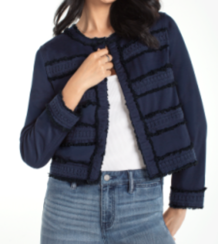 Effortless sophistication meets modern edge in this collarless jacket, where clean lines and unexpected texture create instant visual interest. The strategic fray detailing and delicate lace accents add dimension without overwhelming—perfect for layering over dresses, tees, or tanks. Whether you're dressing up for an evening out or elevating your everyday look, this versatile piece transitions seamlessly from season to season. The collarless silhouette elongates the neckline while maintaining a polished, contemporary feel that works as hard as you do.